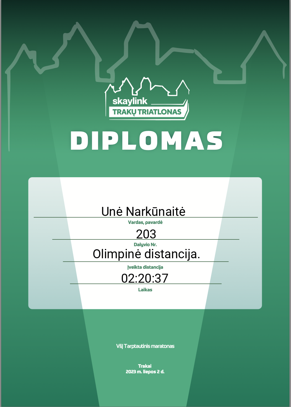 | 30 | Unė Narkūnaitė | BTT ( Best Triathlon Team ) | 203 | Lithuania | Olimpinė distancija. | 02:20:37 | Diplomas |