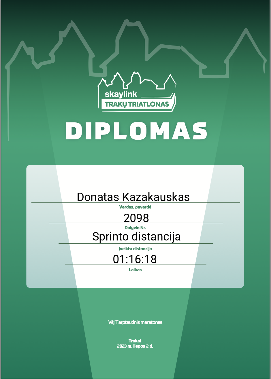 | 30 | Mantas Zubavičius | Klaipėdos Triatlono Klubas | 2072 | Lithuania | Sprinto distancija | 01:16:14 | Diplomas |
