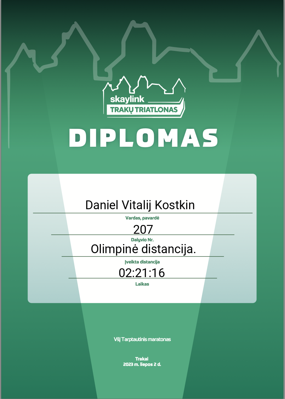 | 33 | Daniel Vitalij Kostkin | Zoomies | 207 | Lithuania | Olimpinė distancija. | 02:21:16 | Diplomas |