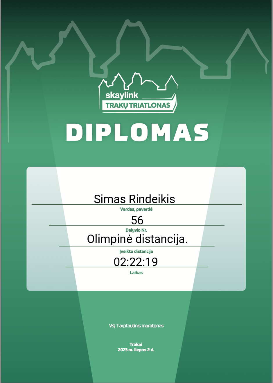 | 35 | Simas Rindeikis | Klaipėdos Triatlono Klubas | 56 | Lithuania | Olimpinė distancija. | 02:22:19 | Diplomas |