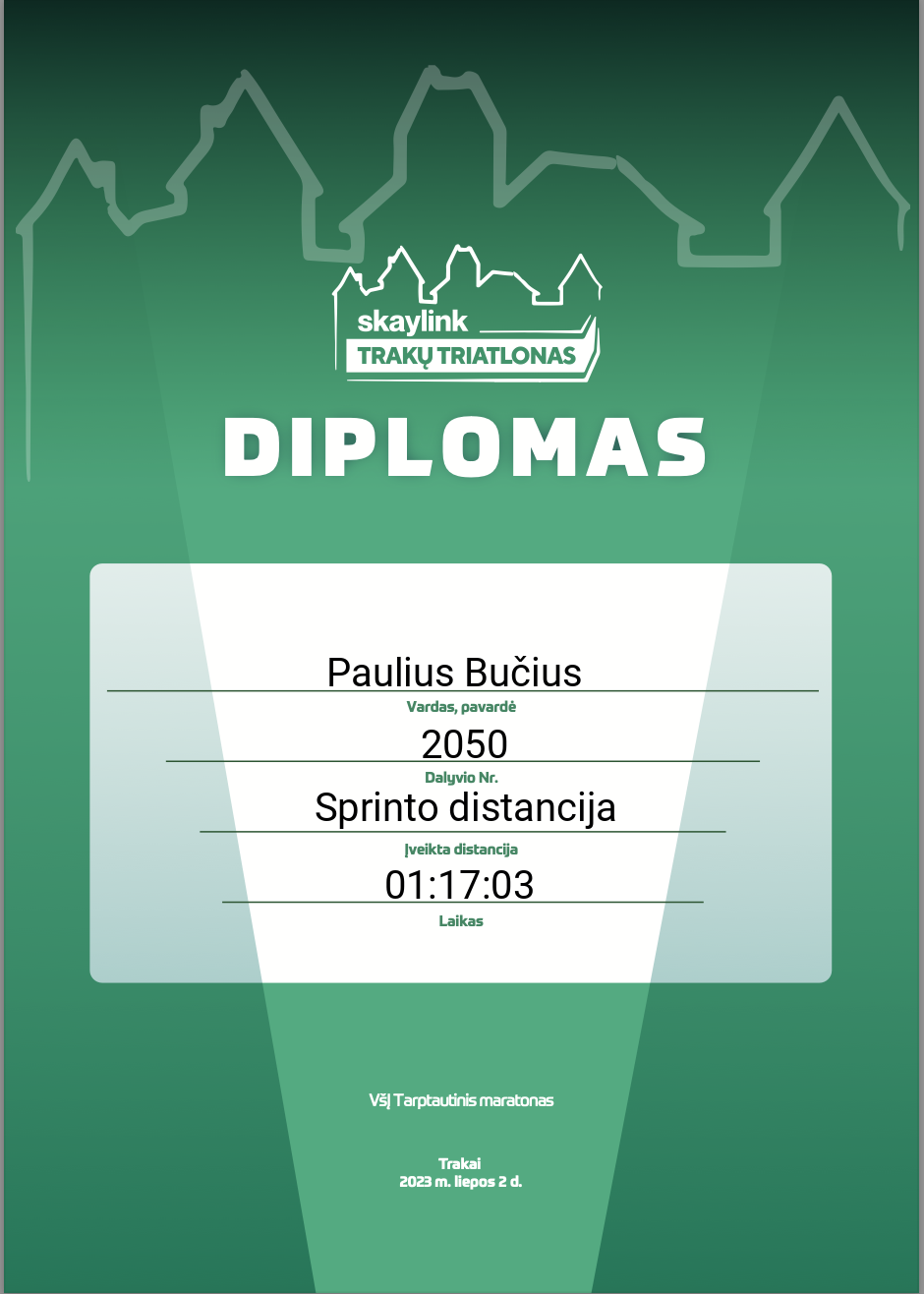 | 41 | Domantas Gražinskis | Marijampolės triatlono draugija | 2075 | Lithuania | Sprinto distancija | 01:17:37 | Diplomas |