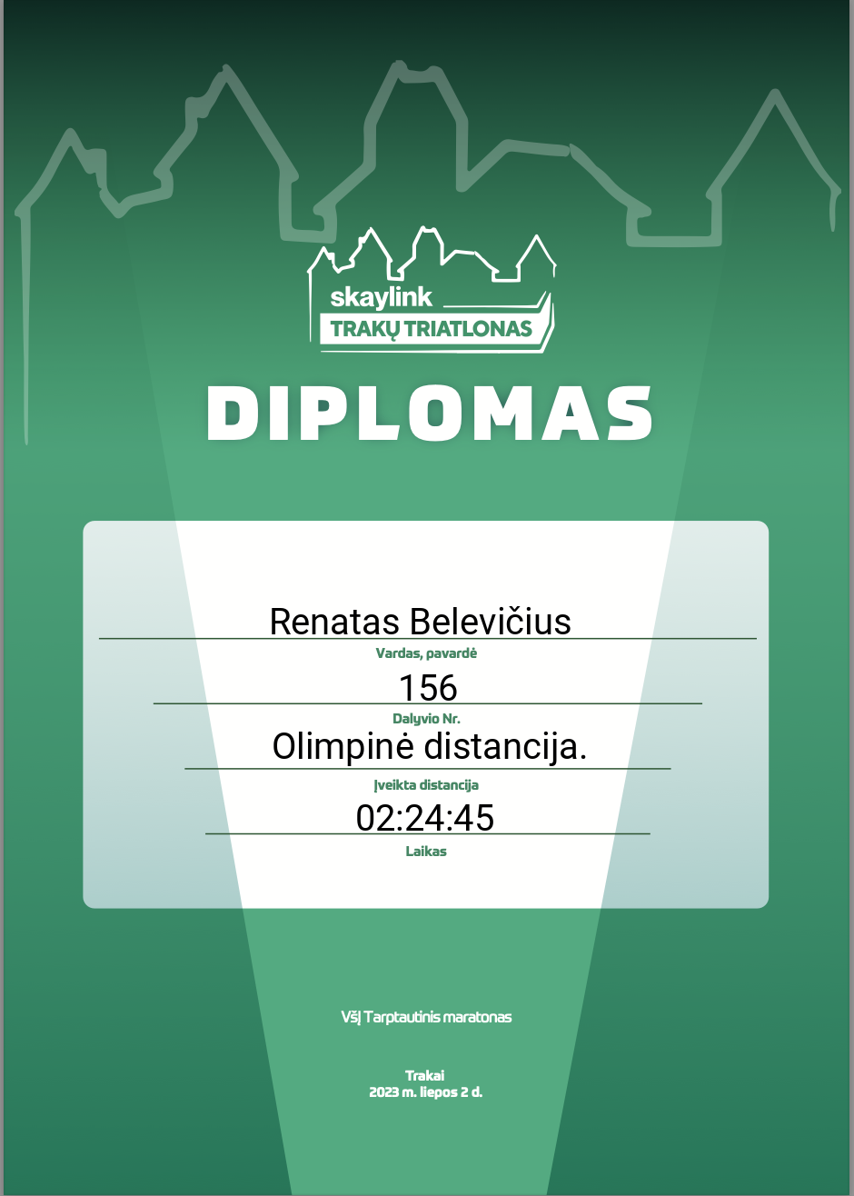 | 41 | Renatas Belevičius | Trakų Triatlono Burelis | 156 | Lithuania | Olimpinė distancija. | 02:24:45 | Diplomas |
