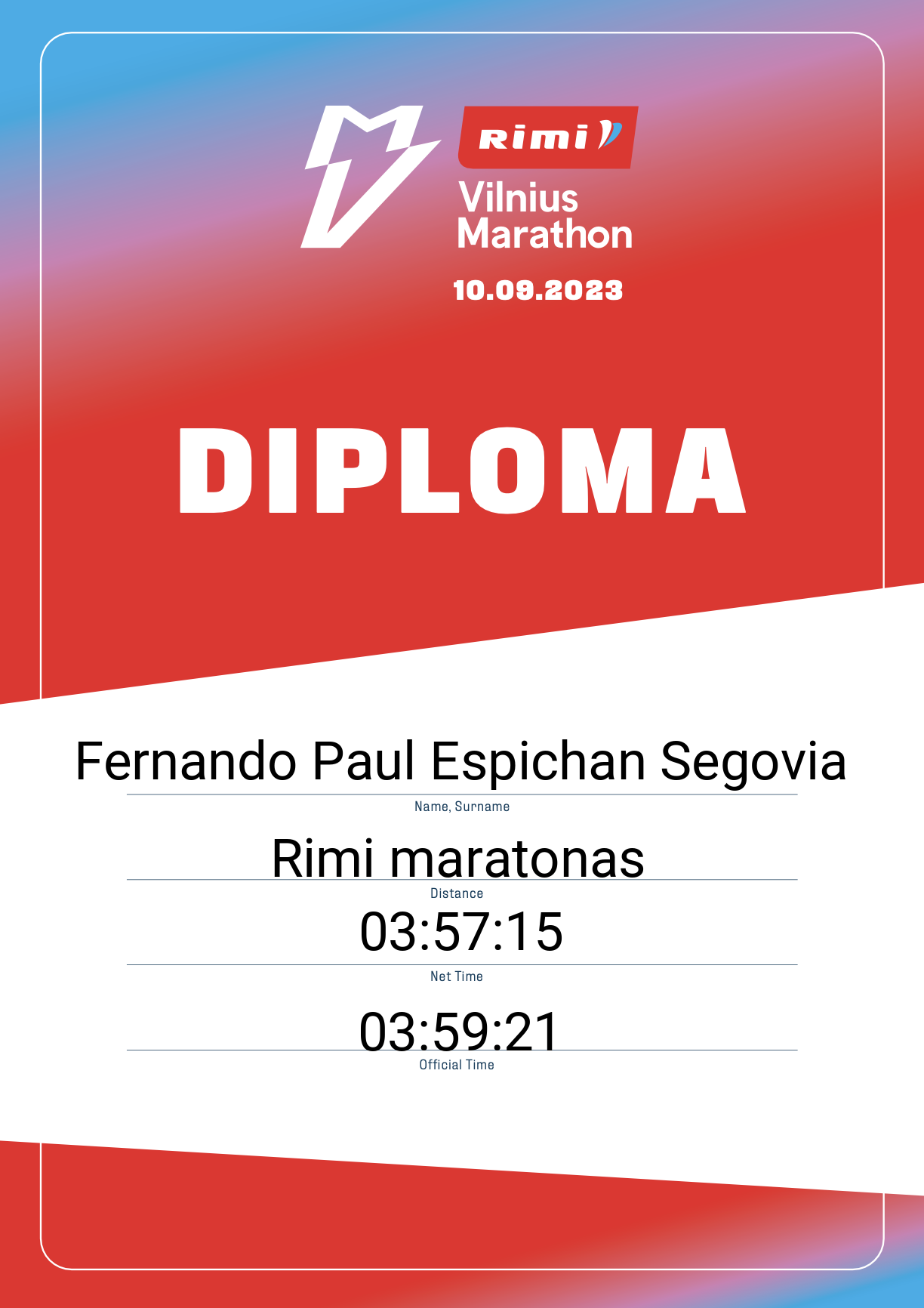 | 429 | Fernando Paul Espichan Segovia | BMI GBS | 703 | Peru | Rimi maratonas | 03:59:21 | Diplomas |