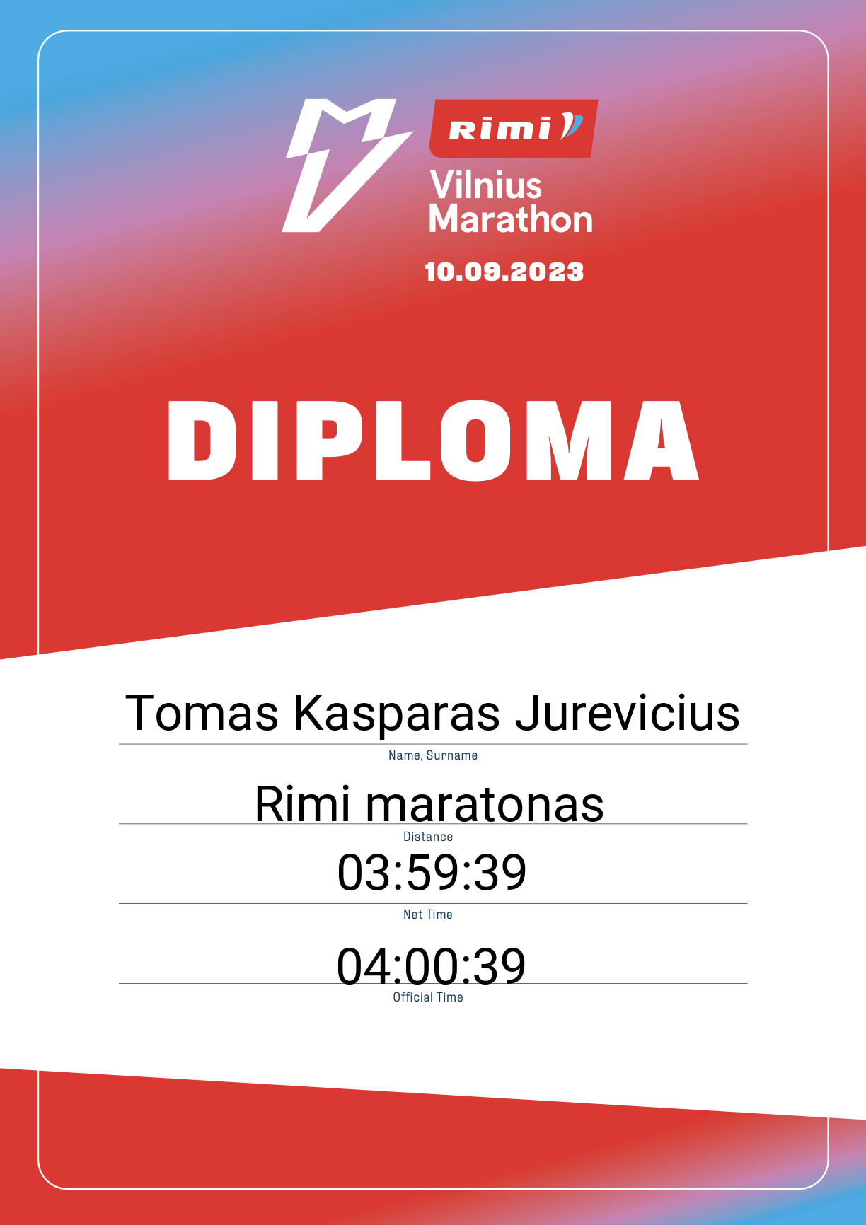 | 446 | Tomas Kasparas Jurevicius | Kasparas sensta | 869 | Lithuania | Rimi maratonas | 04:00:39 | Diplomas |