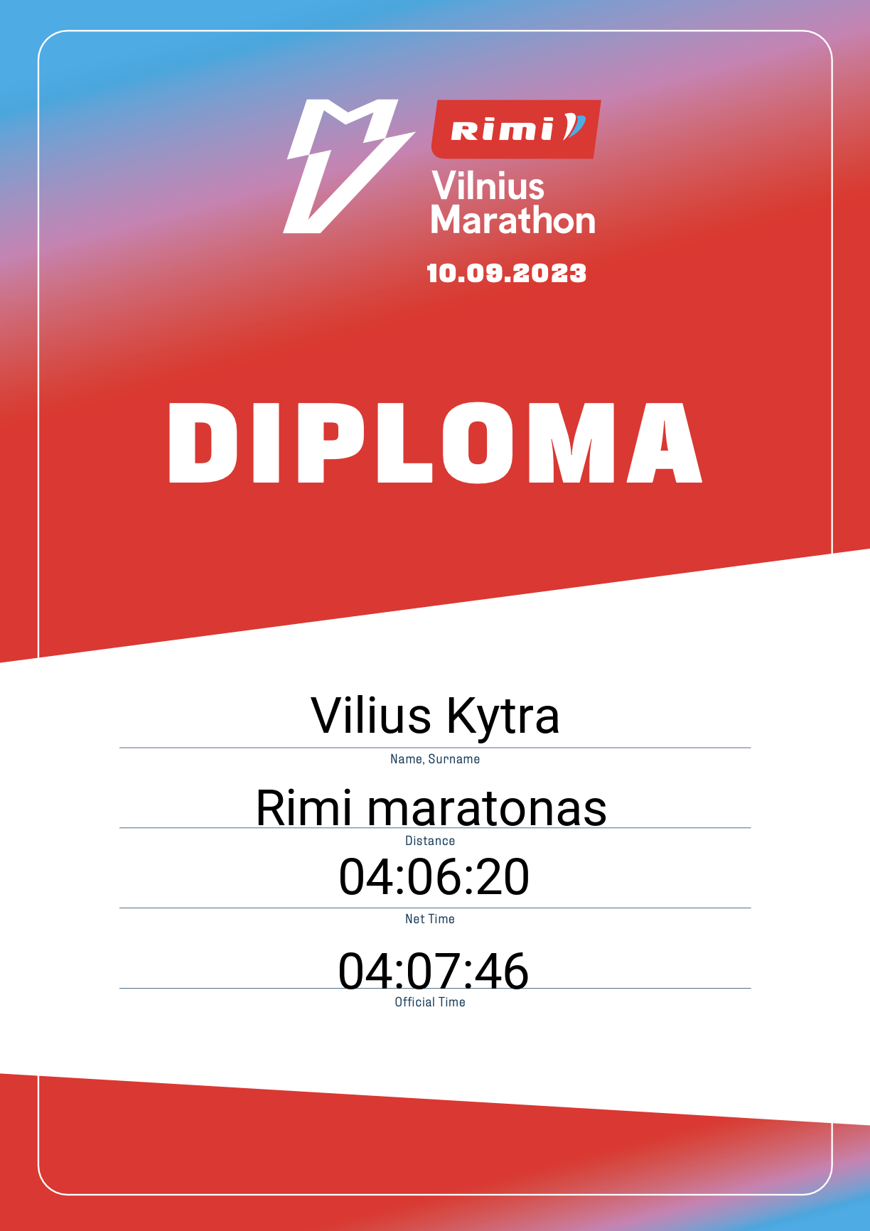 | 346 | Maiklas Gajauskas | 10 | Lithuania | Rimi maratonas | 03:52:58 | Diplomas | |