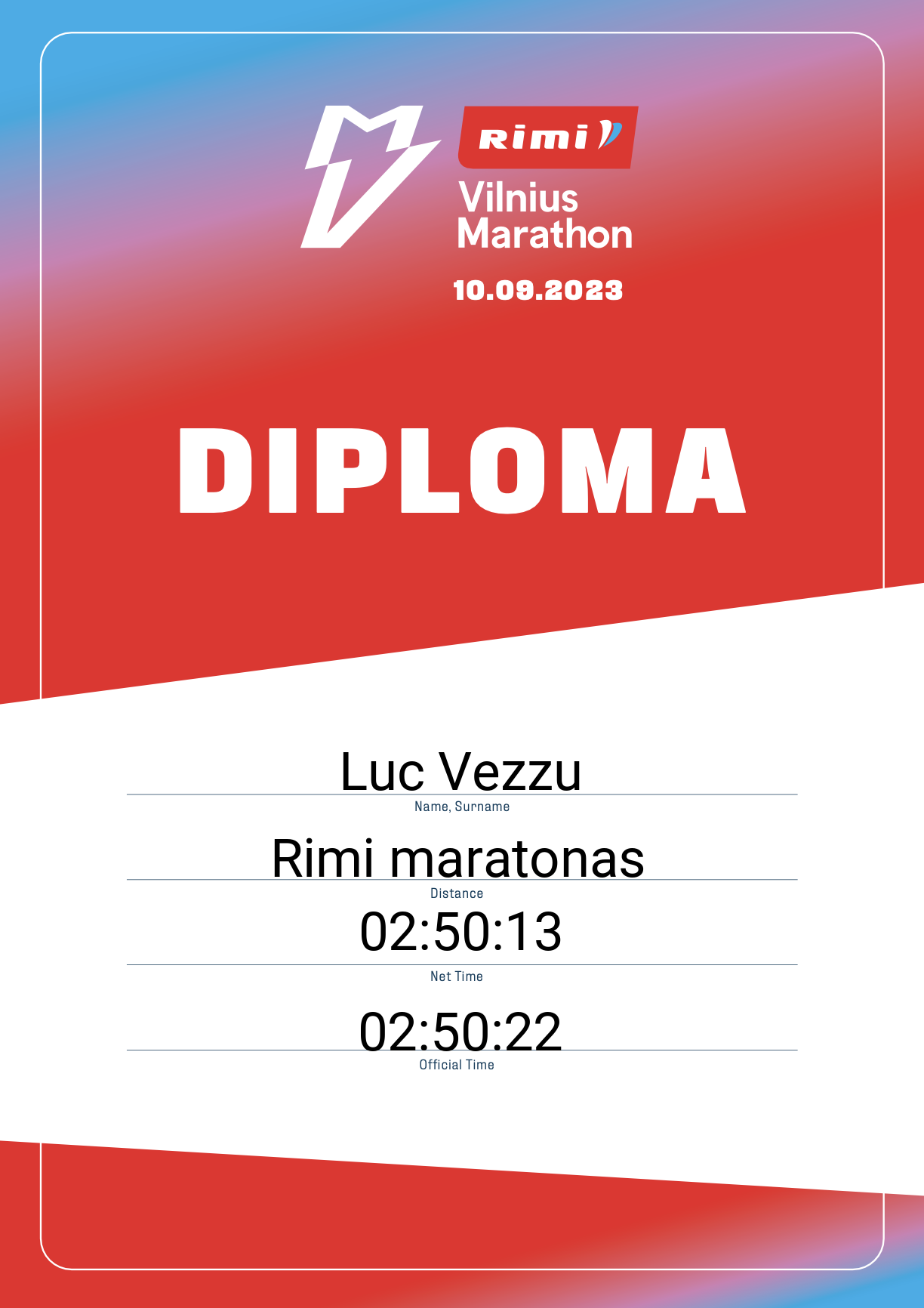 | 7 | paulius gedvilas | Bėgimo klubas | 1308 | Lithuania | Rimi maratonas | 02:46:38 | Diplomas |