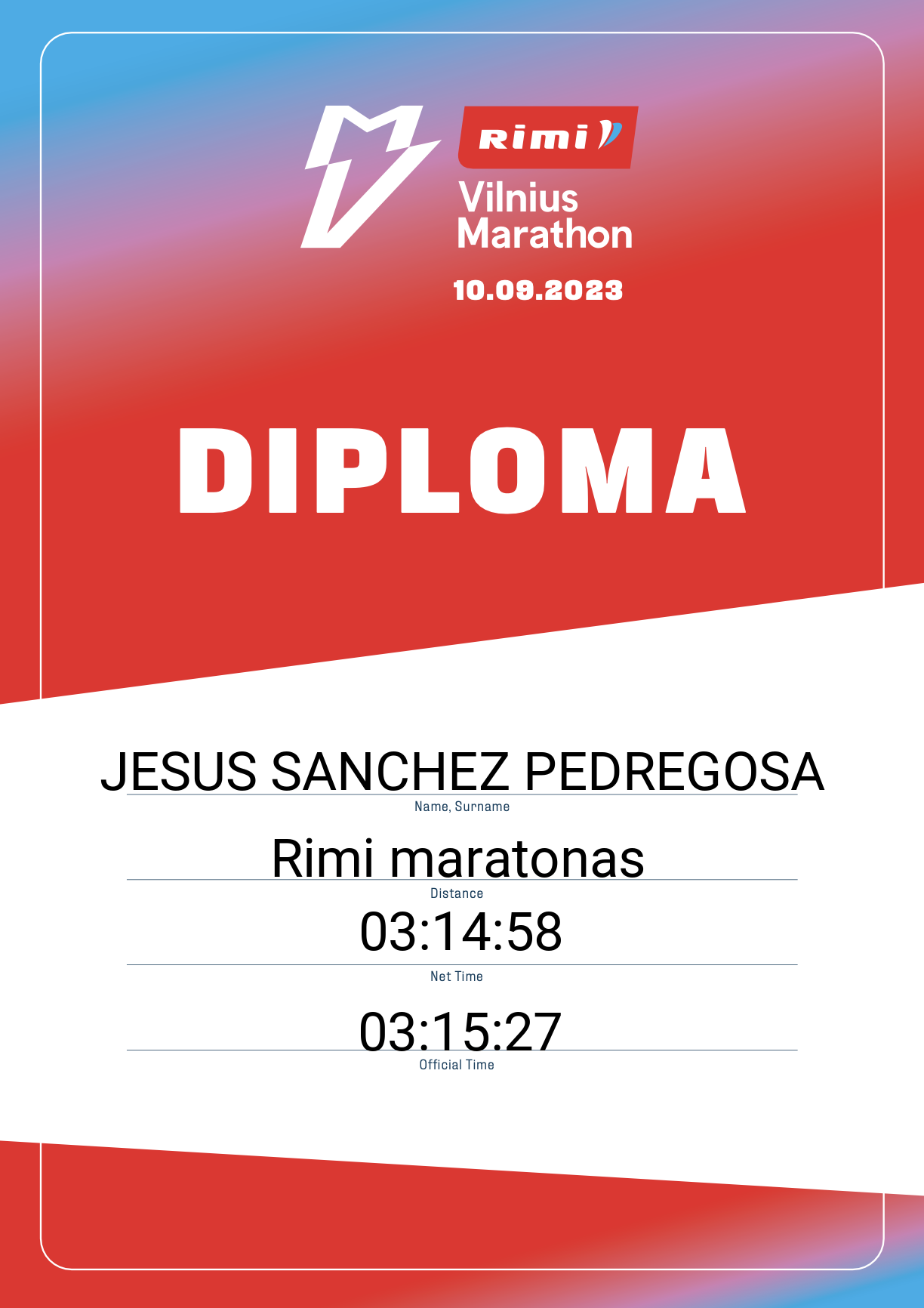 | 85 | JESUS SANCHEZ PEDREGOSA | TRAVELMARATHON.ES | 1083 | Spain | Rimi maratonas | 03:15:27 | Diplomas |