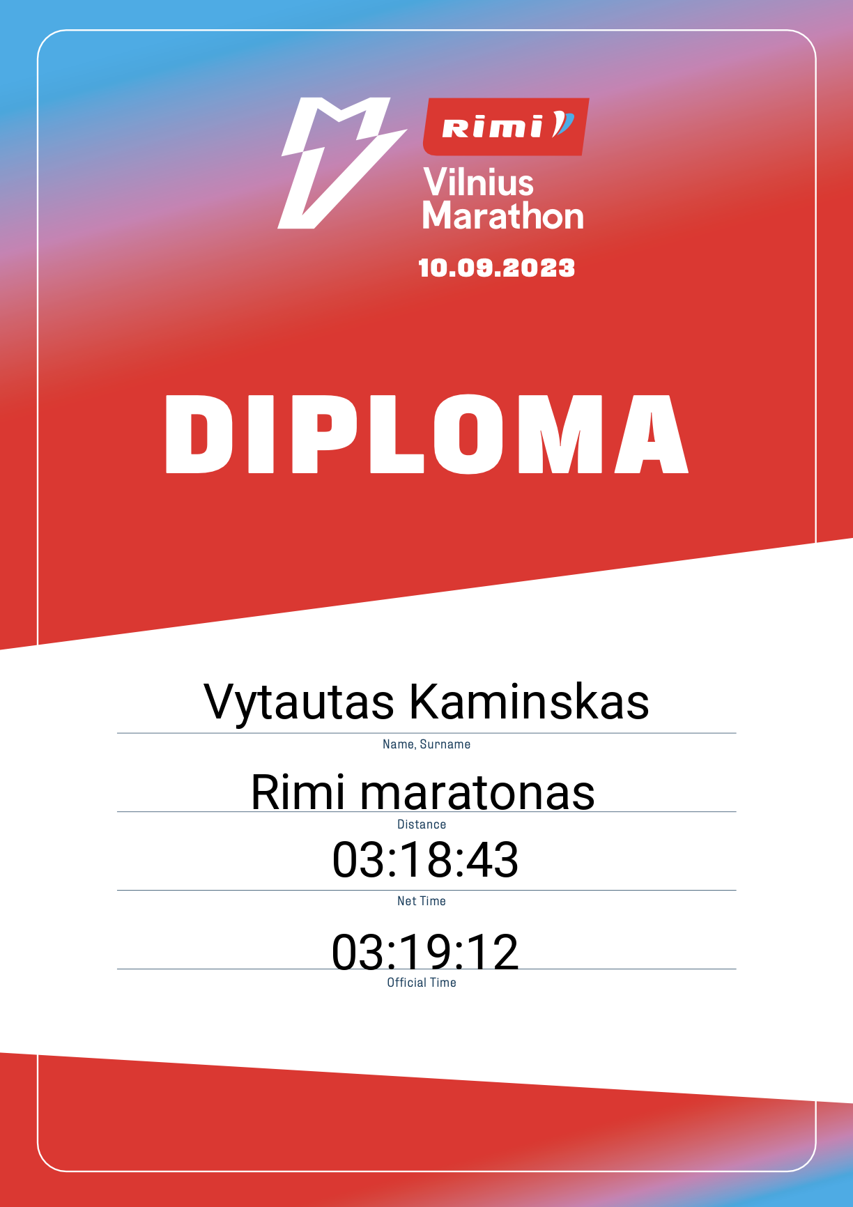 | 89 | Aurimas Ramanauskas | Origami runners | 826 | Lithuania | Rimi maratonas | 03:17:12 | Diplomas |