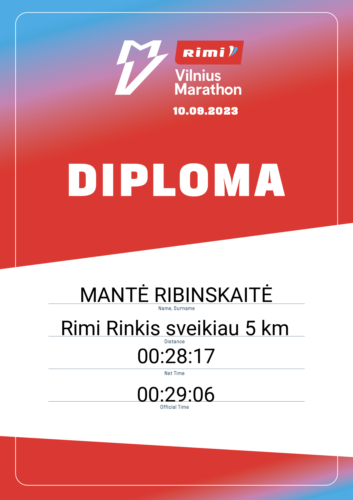 | 618 | MANTĖ RIBINSKAITĖ | Erasmus+ | 32594 | Lithuania | Rimi Rinkis sveikiau 5 km | 00:29:06 | Diplomas |