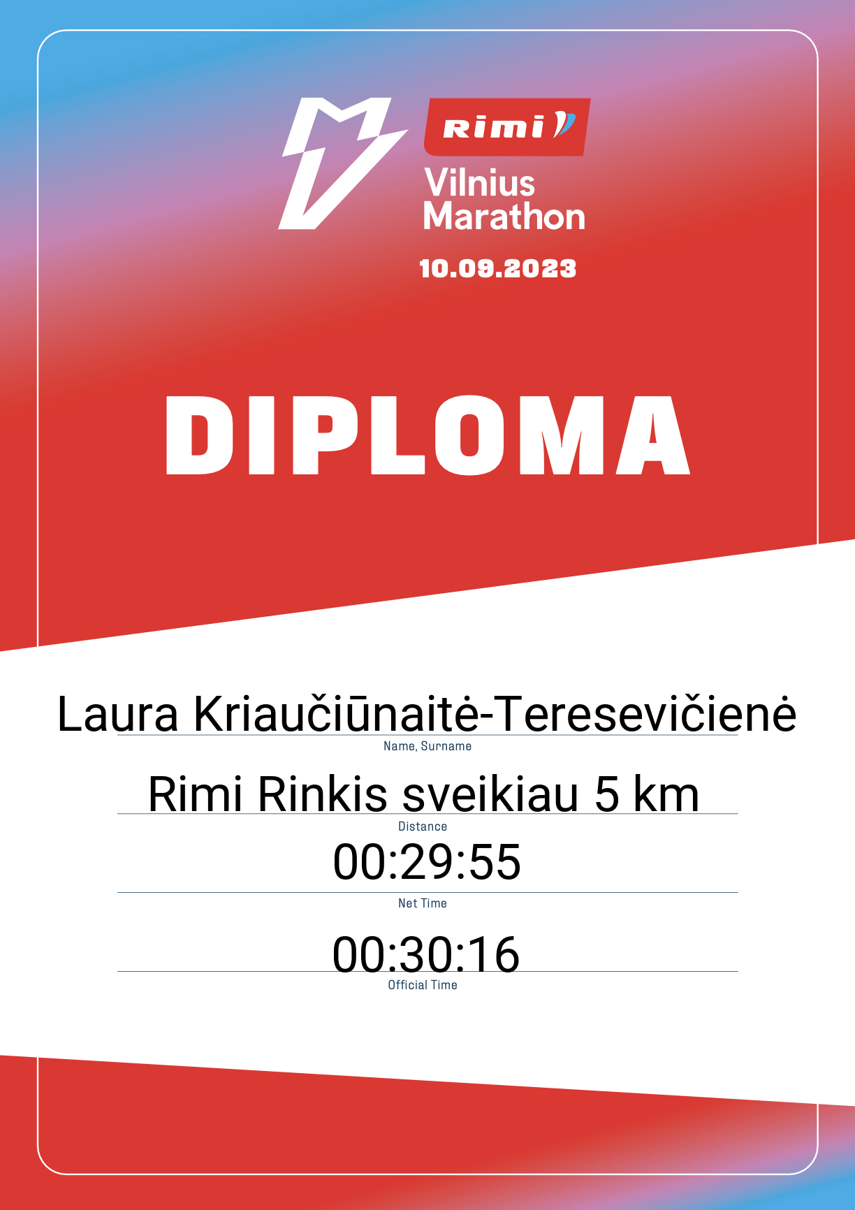 | 778 | Laura Kriaučiūnaitė-Teresevičienė | Ignitis Grupė | 32595 | Lithuania | Rimi Rinkis sveikiau 5 km | 00:30:16 | Diplomas |