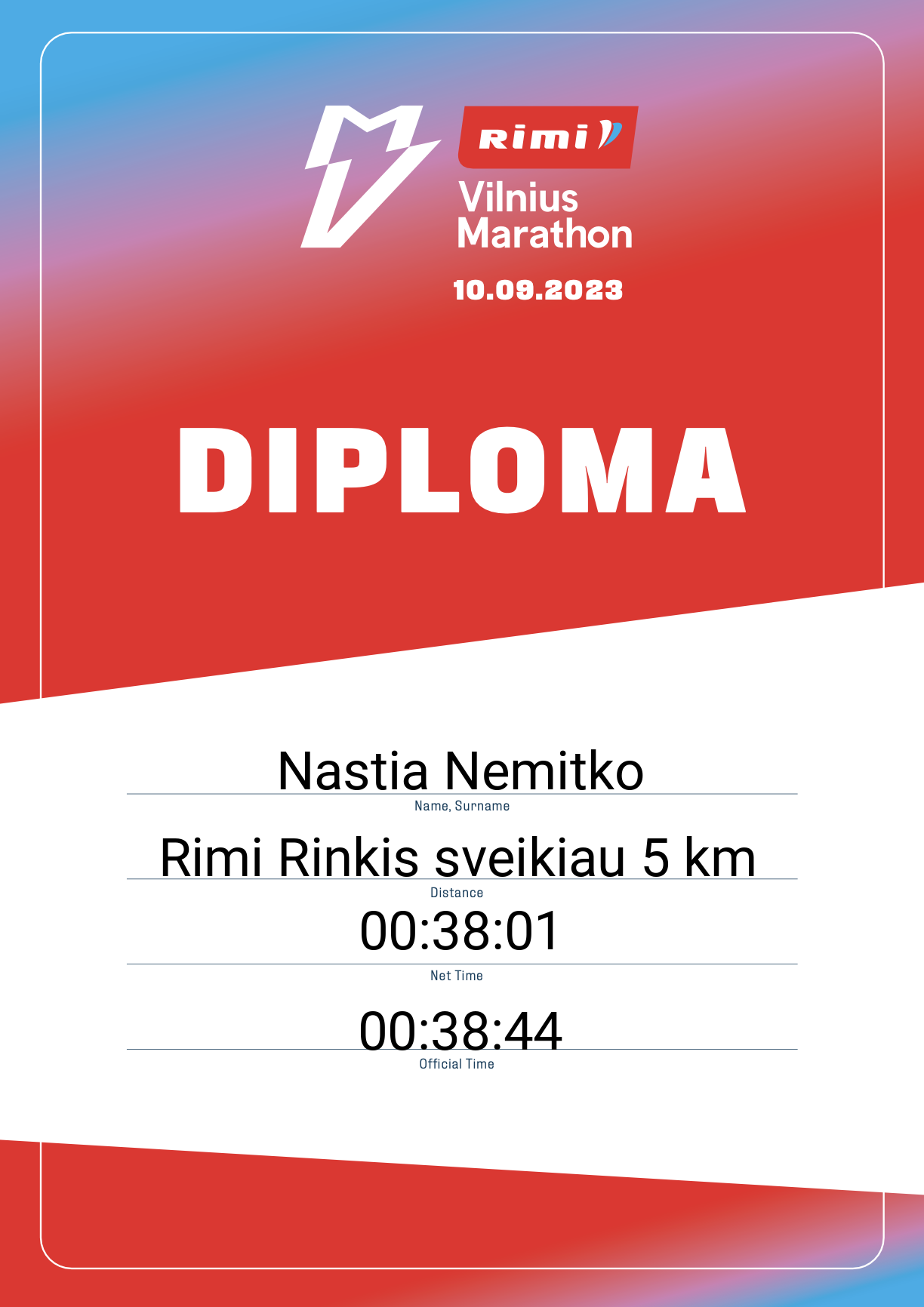 | 1944 | Nastia Nemitko | 33329 | Lithuania | Rimi Rinkis sveikiau 5 km | 00:38:44 | Diplomas | |