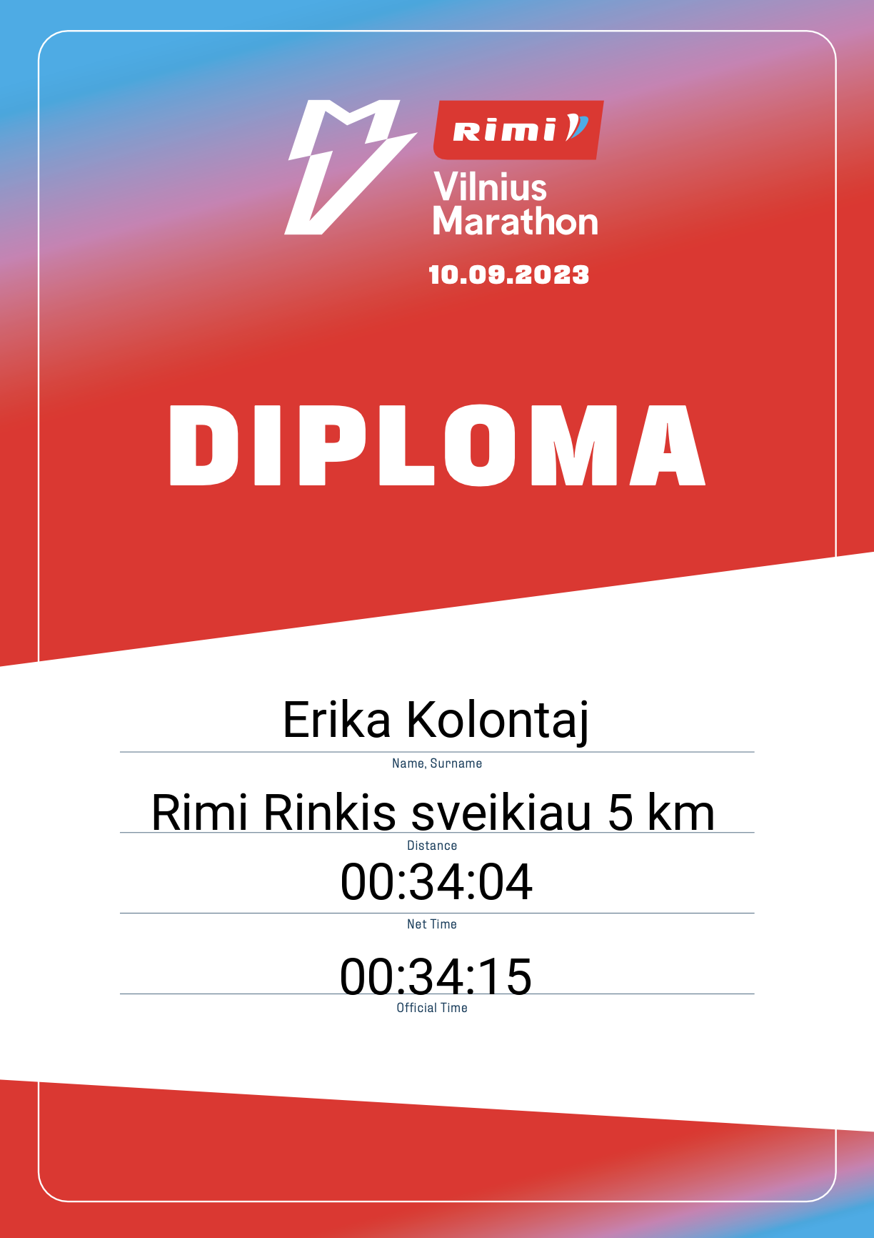 | 1314 | Erika Kolontaj | 30376 | Lithuania | Rimi Rinkis sveikiau 5 km | 00:34:15 | Diplomas | |