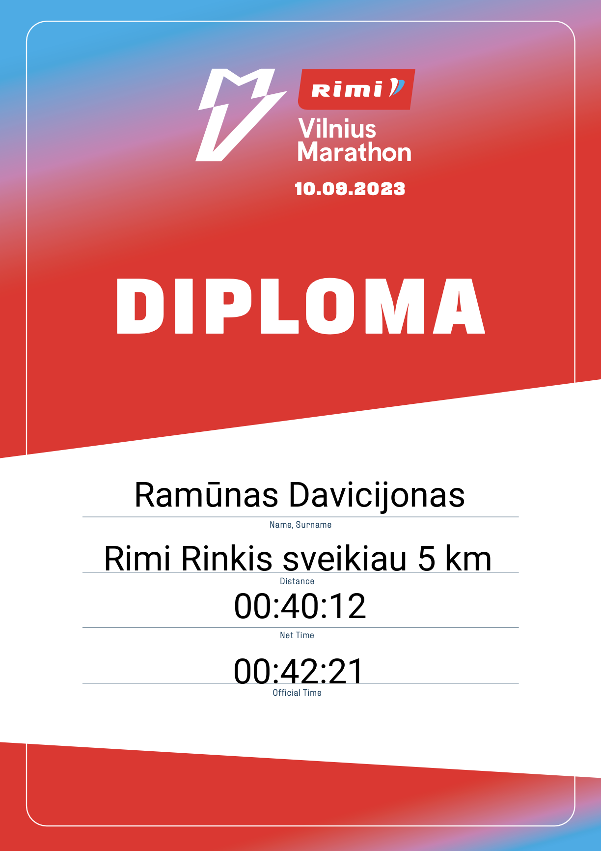 | 2269 | Ramūnas Davicijonas | 30379 | Lithuania | Rimi Rinkis sveikiau 5 km | 00:42:21 | Diplomas | |