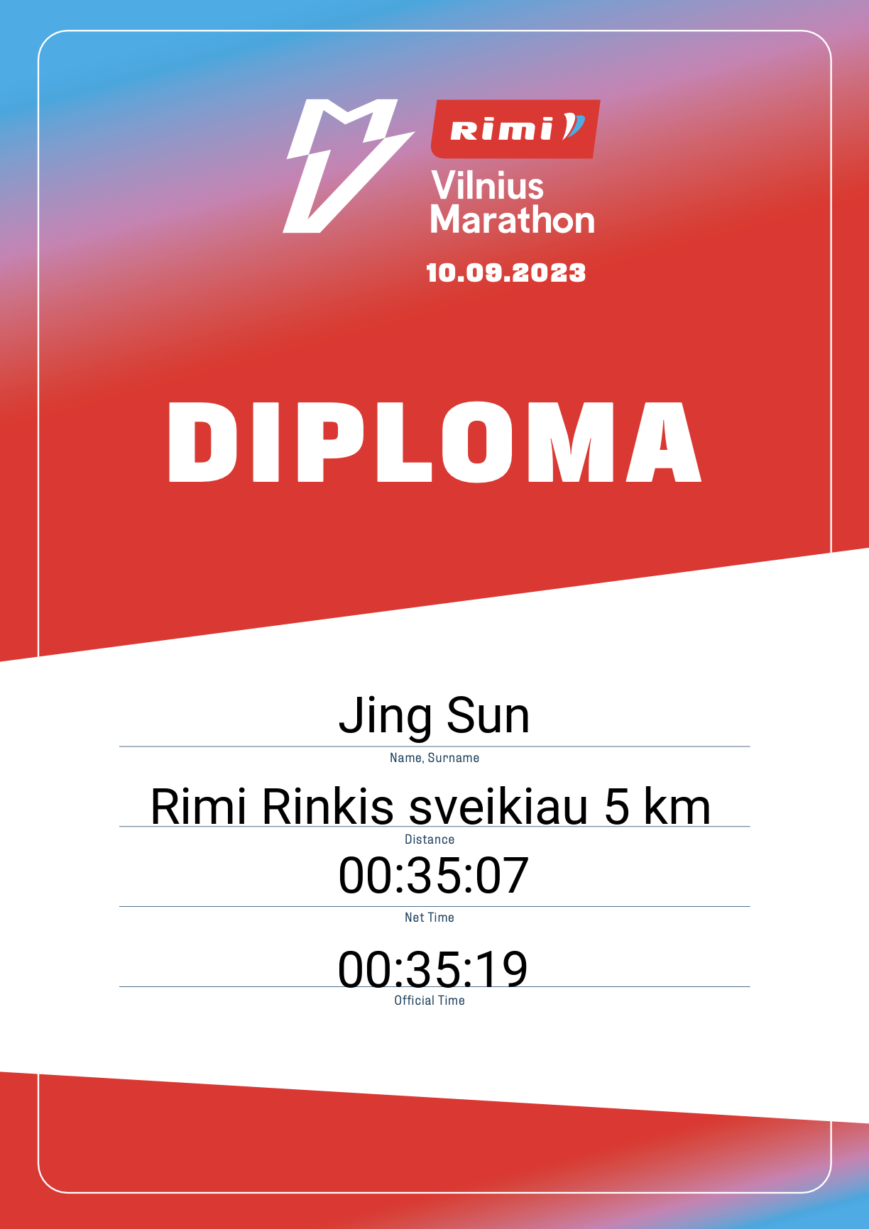 | 1475 | Jing Sun | 30473 | Lithuania | Rimi Rinkis sveikiau 5 km | 00:35:19 | Diplomas | |