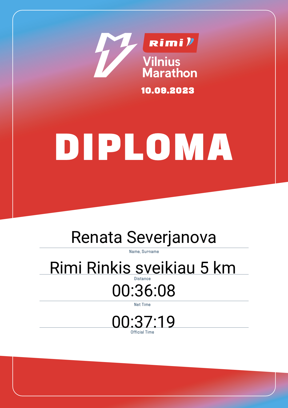 | 1751 | Renata Severjanova | YARA Lietuva | 30475 | Lithuania | Rimi Rinkis sveikiau 5 km | 00:37:19 | Diplomas |