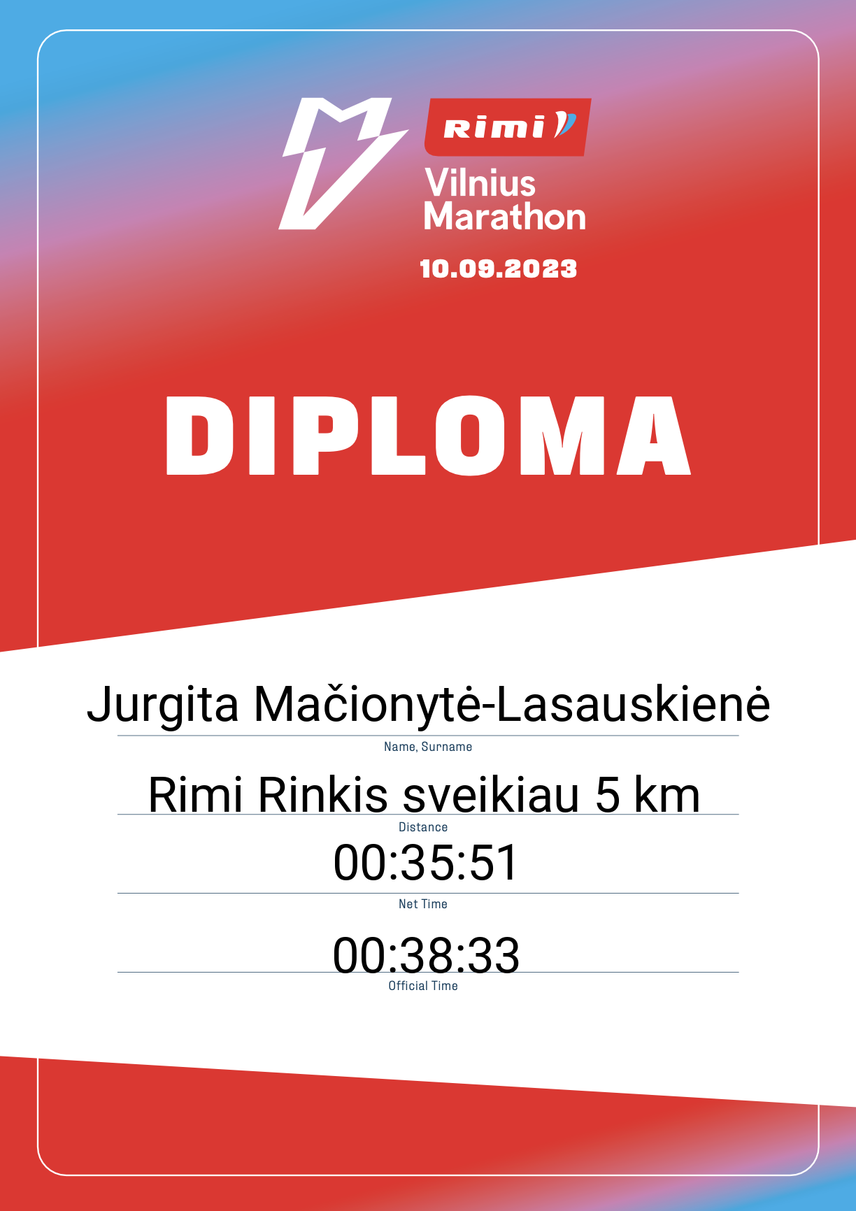 | 1921 | Jurgita Mačionytė-Lasauskienė | 30492 | Lithuania | Rimi Rinkis sveikiau 5 km | 00:38:33 | Diplomas | |