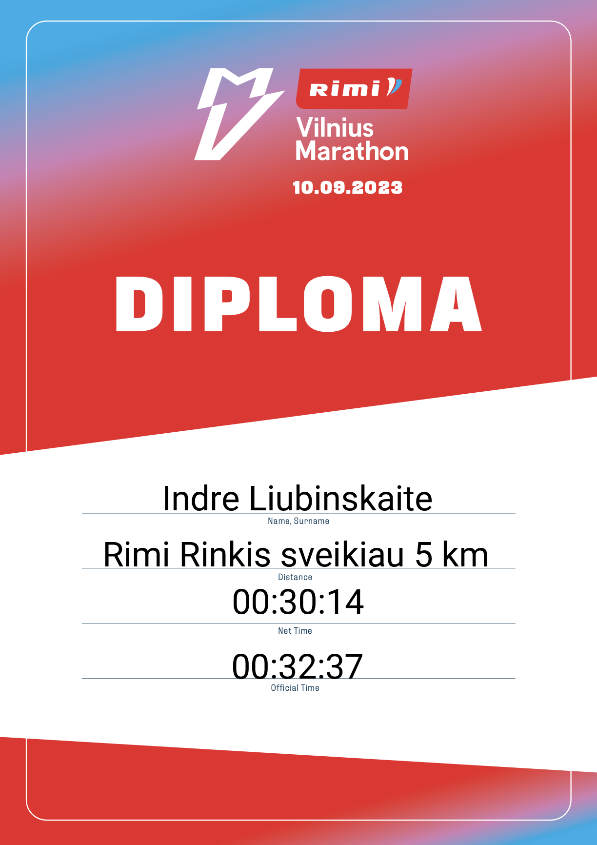 | 1074 | Indre Liubinskaite | 30524 | Lithuania | Rimi Rinkis sveikiau 5 km | 00:32:37 | Diplomas | |