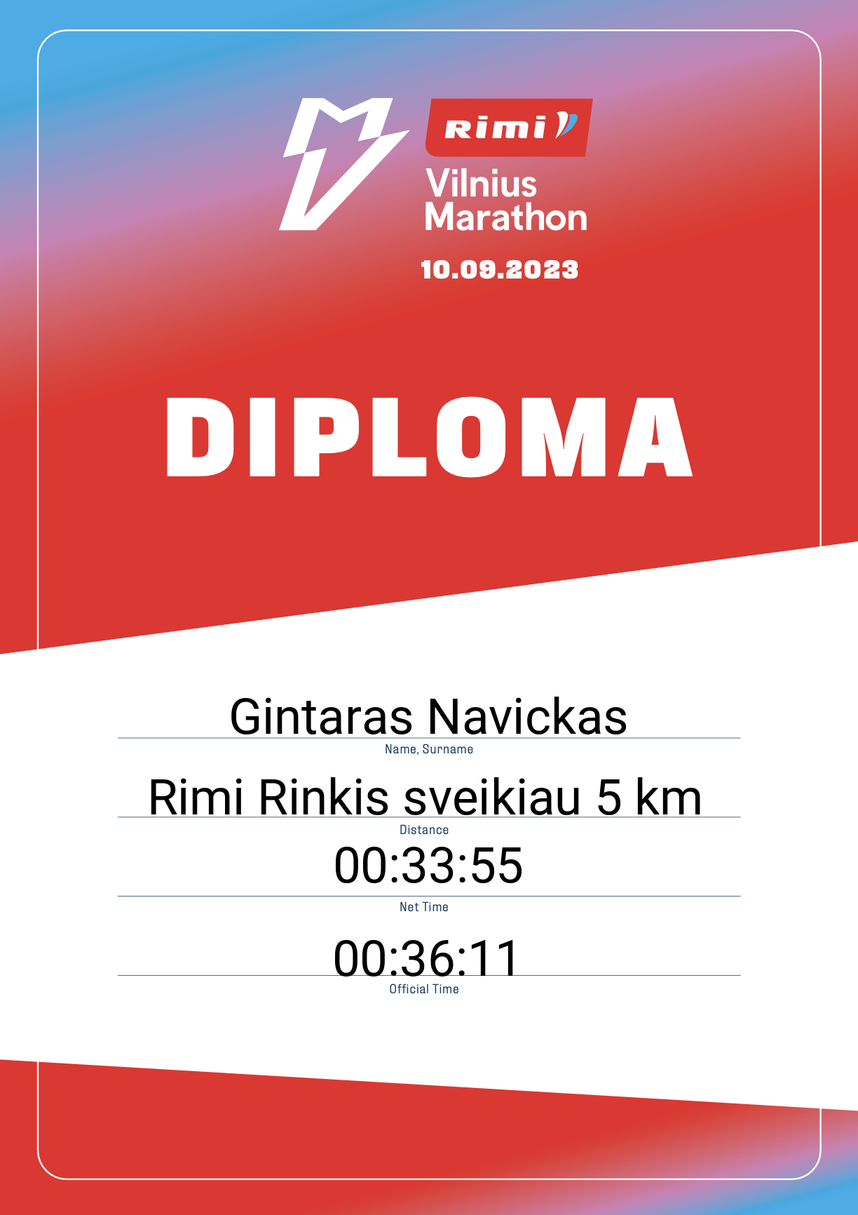 | 1608 | Gintaras Navickas | 30671 | Lithuania | Rimi Rinkis sveikiau 5 km | 00:36:11 | Diplomas | |