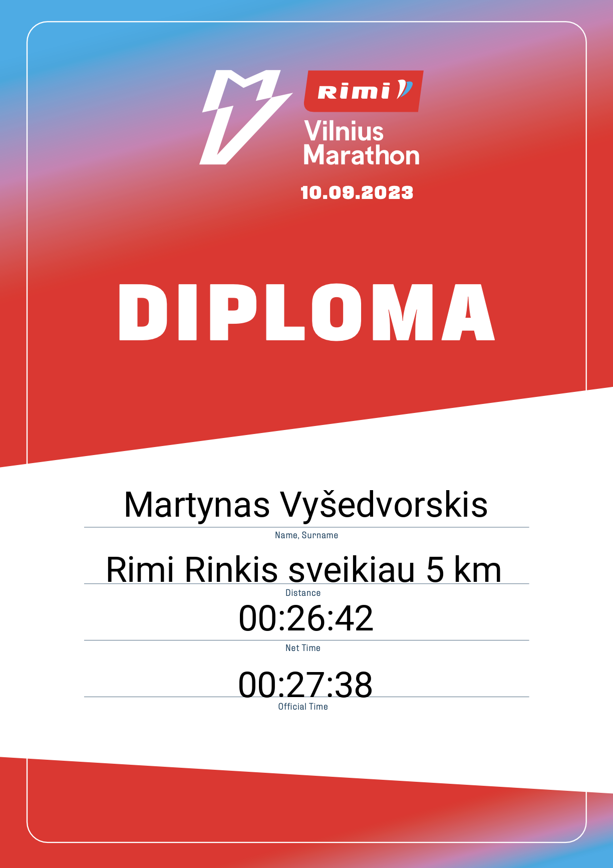 | 464 | Martynas Vyšedvorskis | KAM | 31113 | Lithuania | Rimi Rinkis sveikiau 5 km | 00:27:38 | Diplomas |