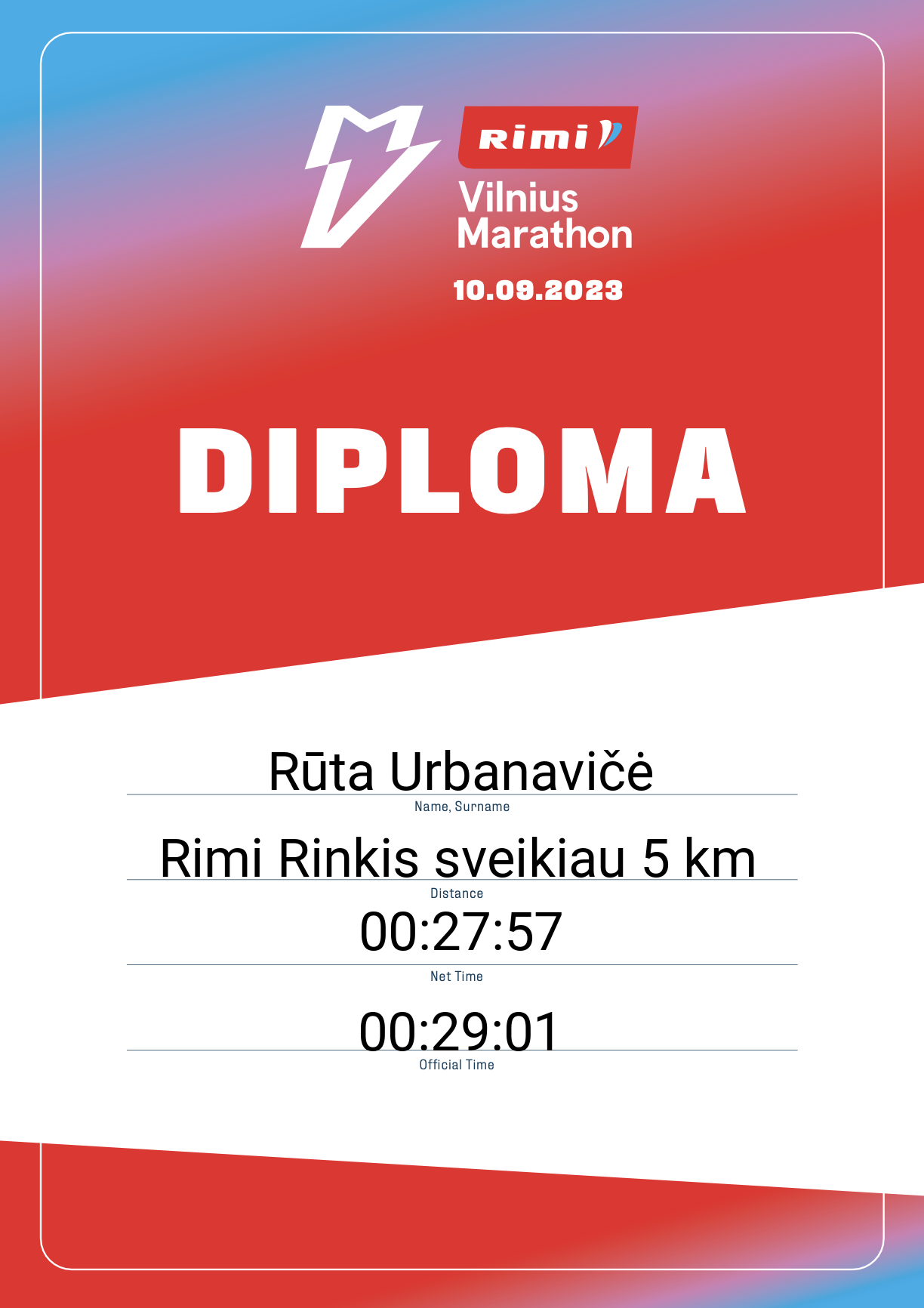 | 606 | Rūta Urbanavičė | 31120 | Lithuania | Rimi Rinkis sveikiau 5 km | 00:29:01 | Diplomas | |