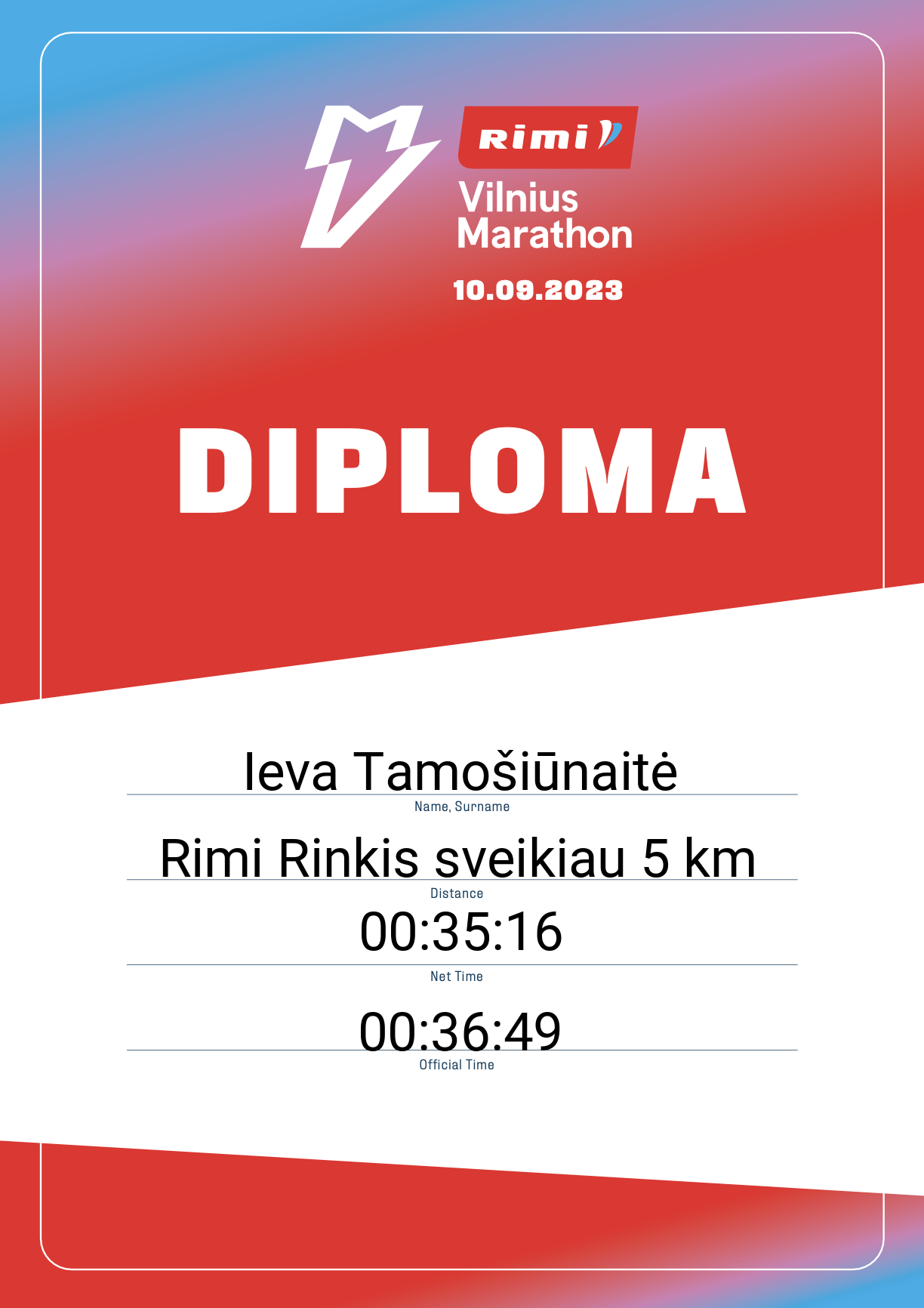 | 1681 | Ieva Tamošiūnaitė | Danske Bank | 31309 | Lithuania | Rimi Rinkis sveikiau 5 km | 00:36:49 | Diplomas |