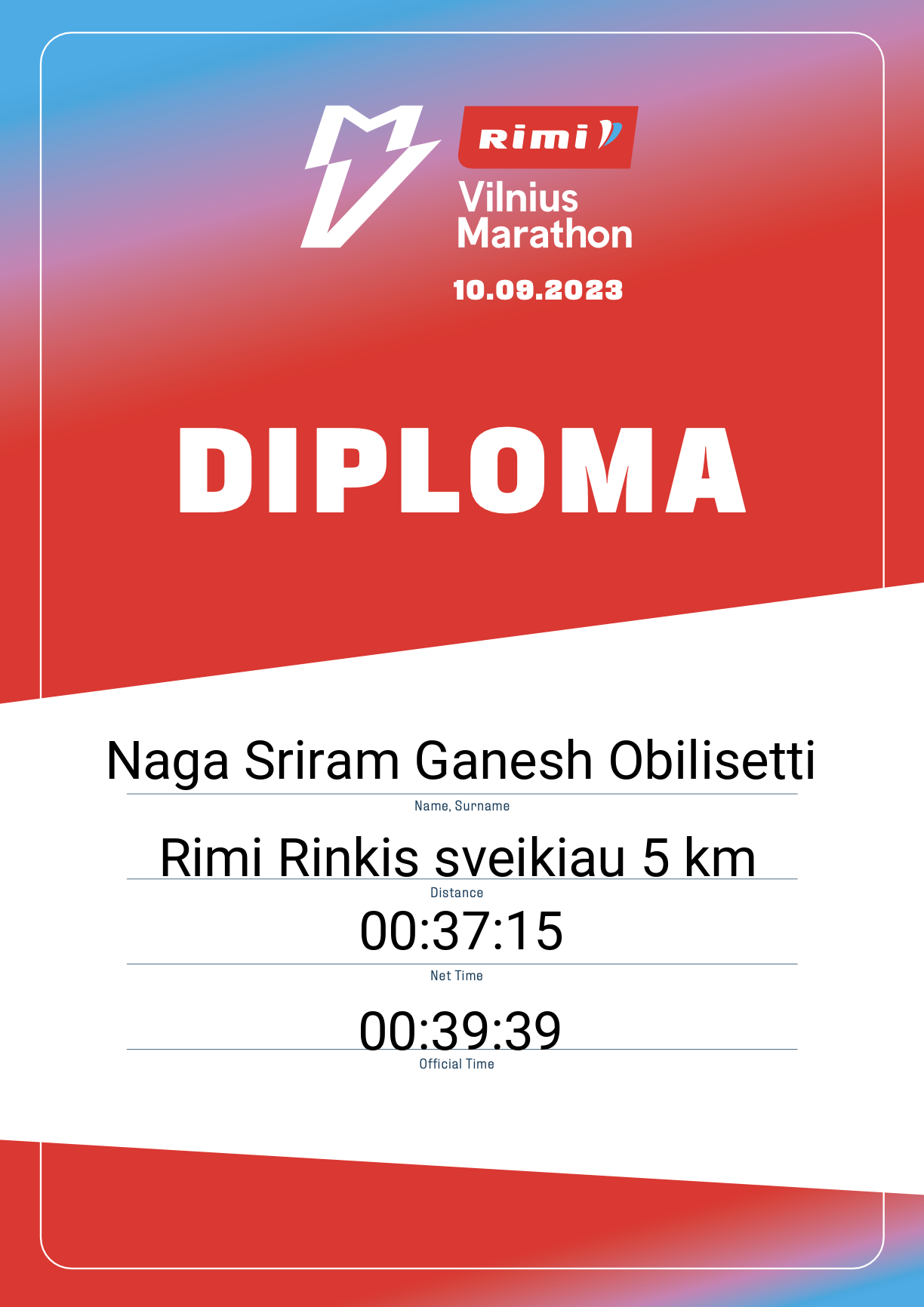 | 2043 | Naga Sriram Ganesh Obilisetti | Cognizant | 31556 | Lithuania | Rimi Rinkis sveikiau 5 km | 00:39:39 | Diplomas |
