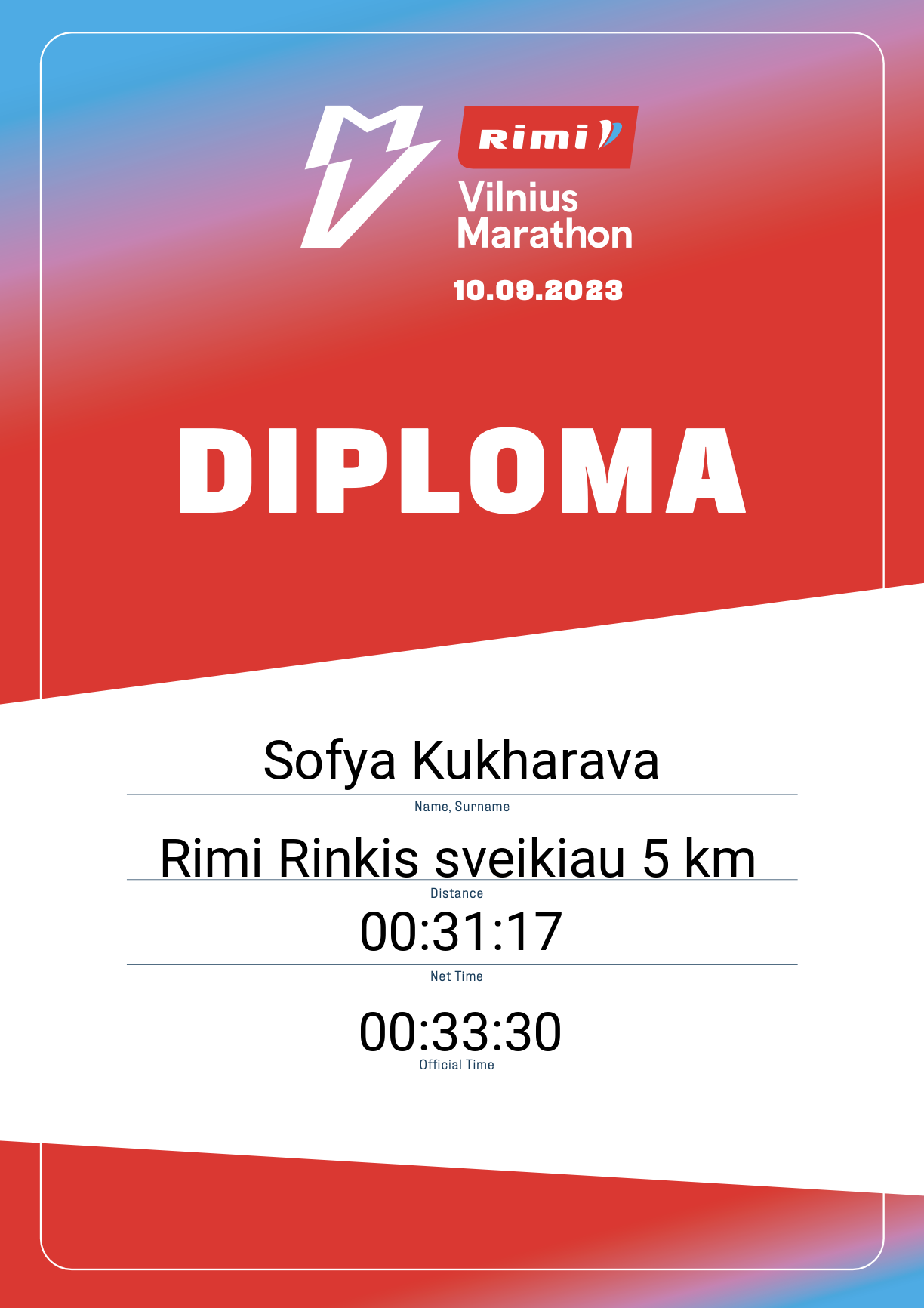 | 1193 | Sofya Kukharava | EHU Students | 32181 | Lithuania | Rimi Rinkis sveikiau 5 km | 00:33:30 | Diplomas |