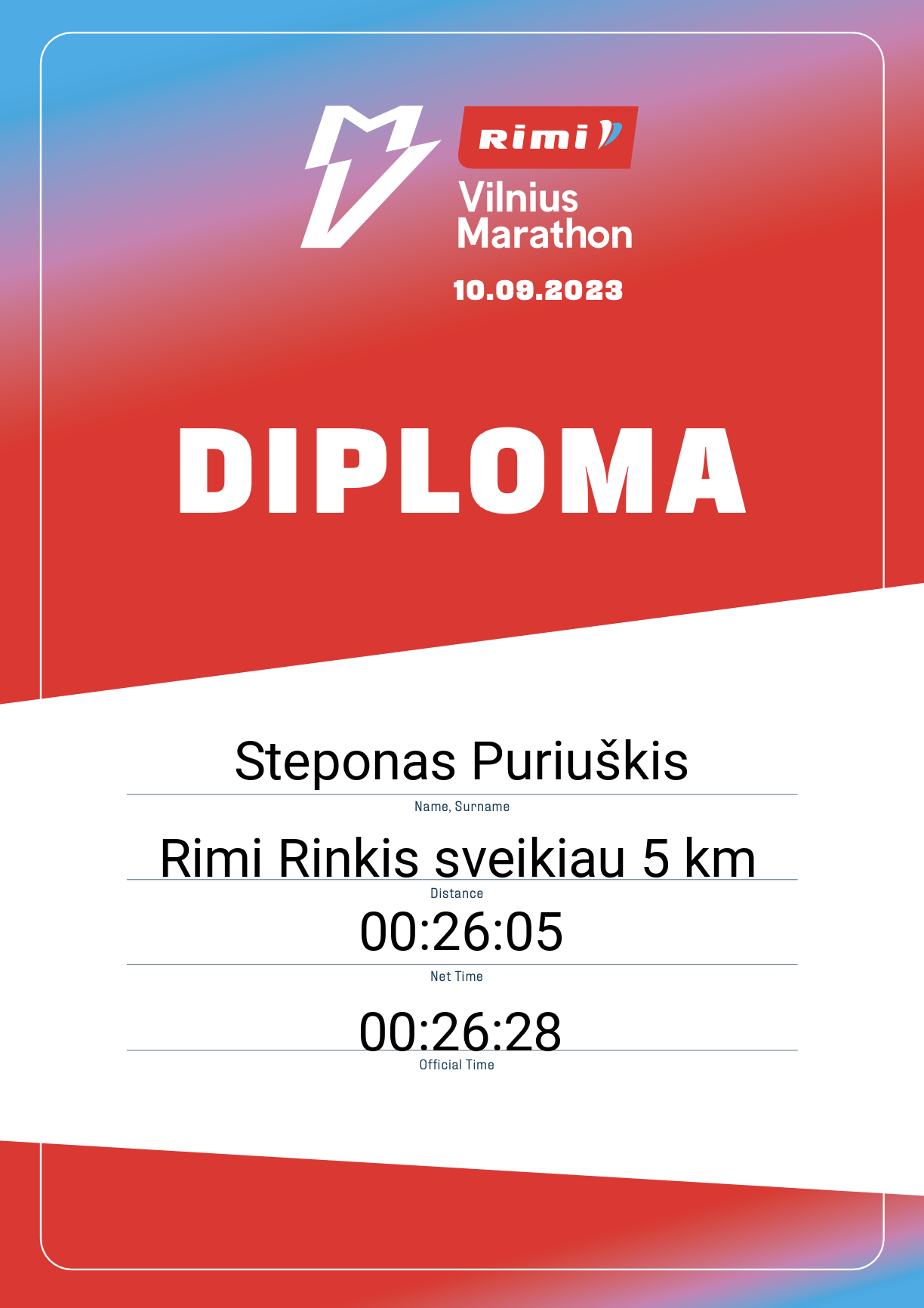 | 356 | Steponas Puriuškis | tietoevry | 31583 | Lithuania | Rimi Rinkis sveikiau 5 km | 00:26:28 | Diplomas |