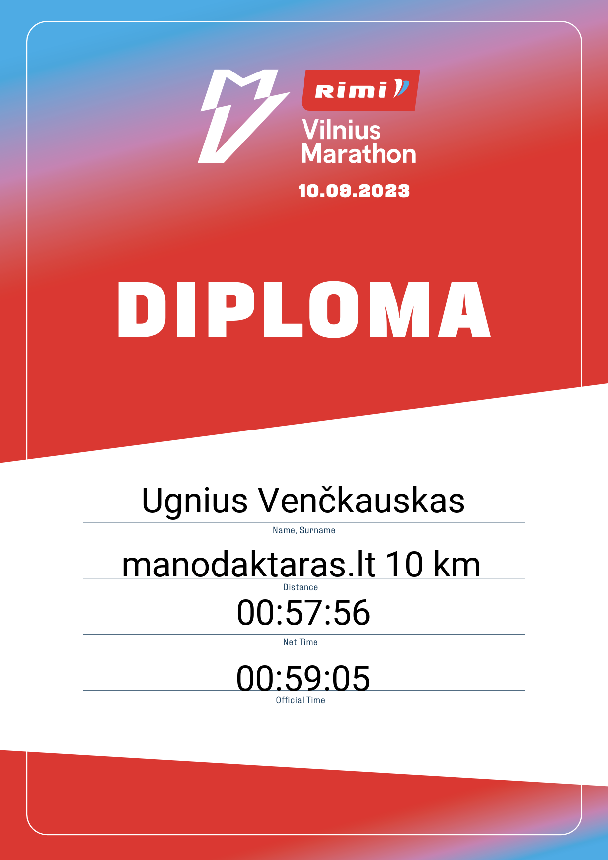 | 921 | Ugnius Venčkauskas | SMN | 20756 | Lithuania | manodaktaras.lt 10 km | 00:59:05 | Diplomas |