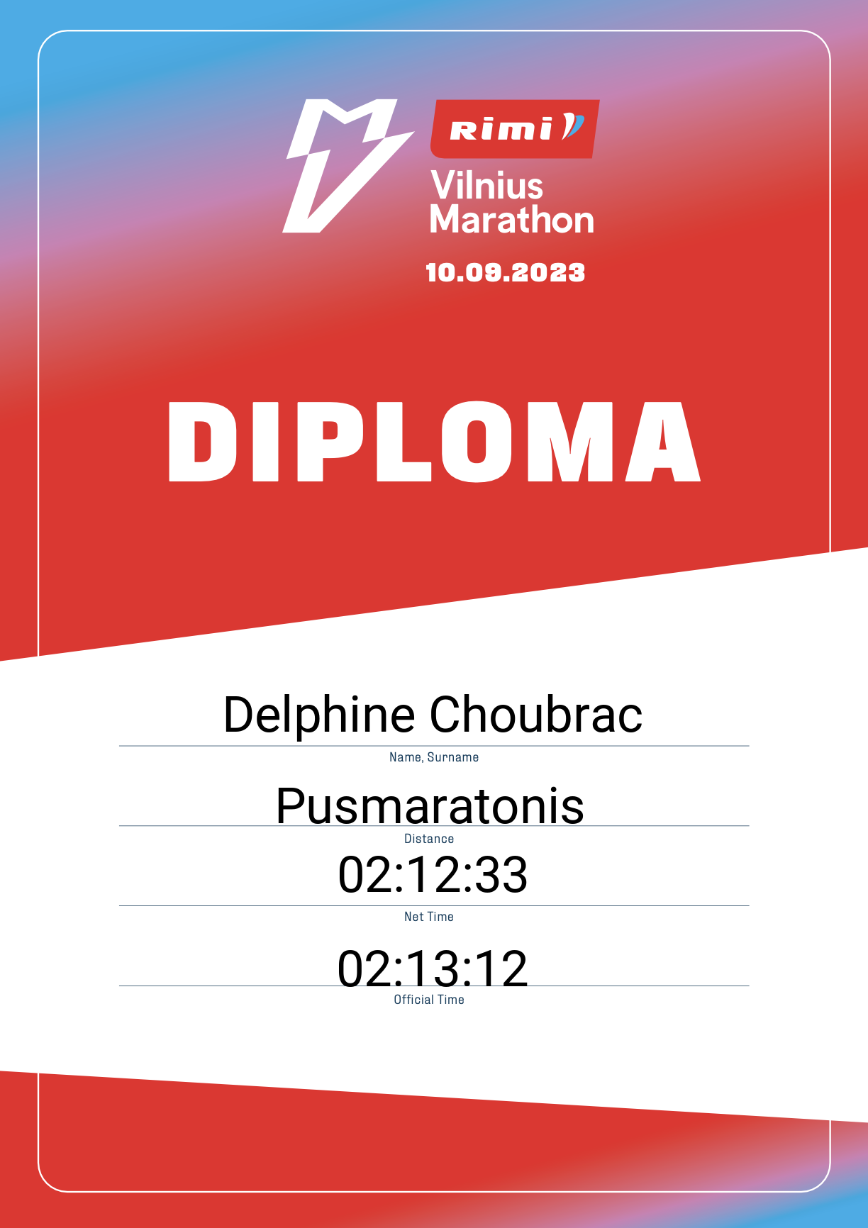 | 1347 | Delphine Choubrac | 13178 | France | Pusmaratonis | 02:13:12 | Diplomas | |