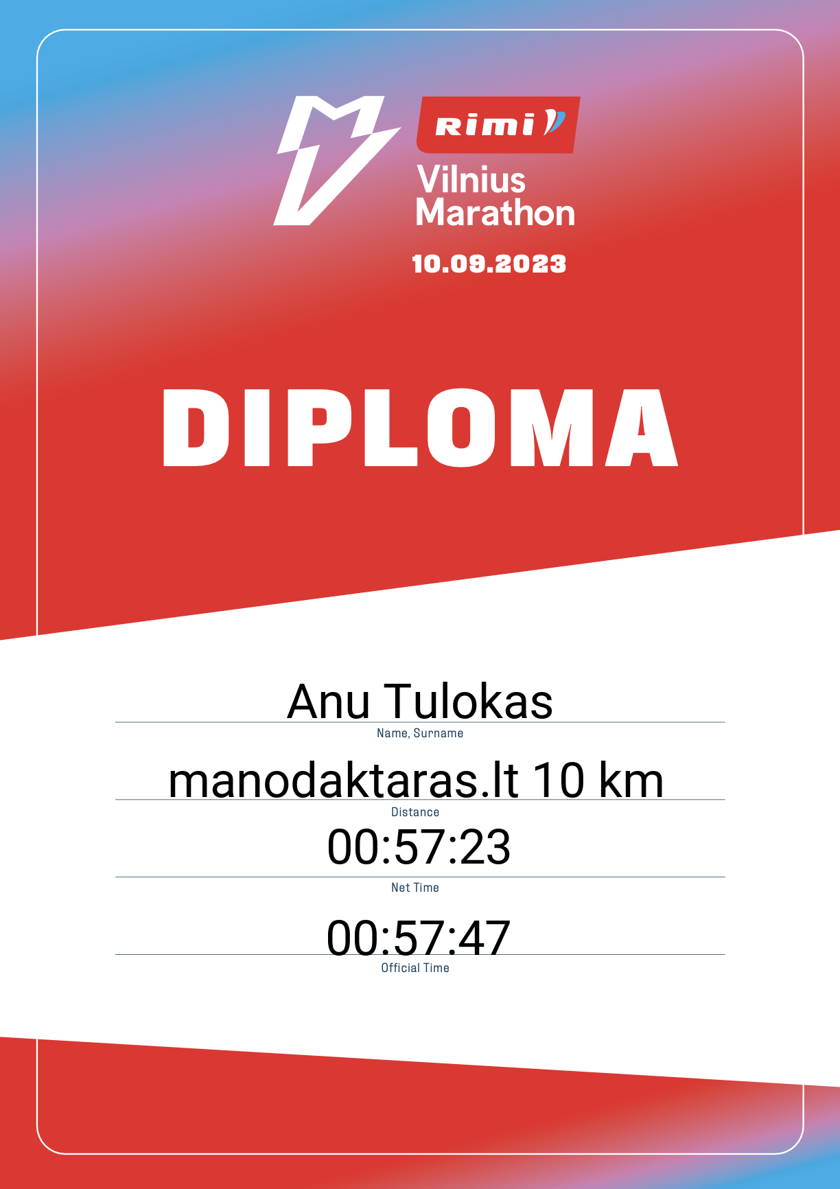 | 61 | Yasmina Sali | 21058 | France | manodaktaras.lt 10 km | 00:42:03 | Diplomas | |