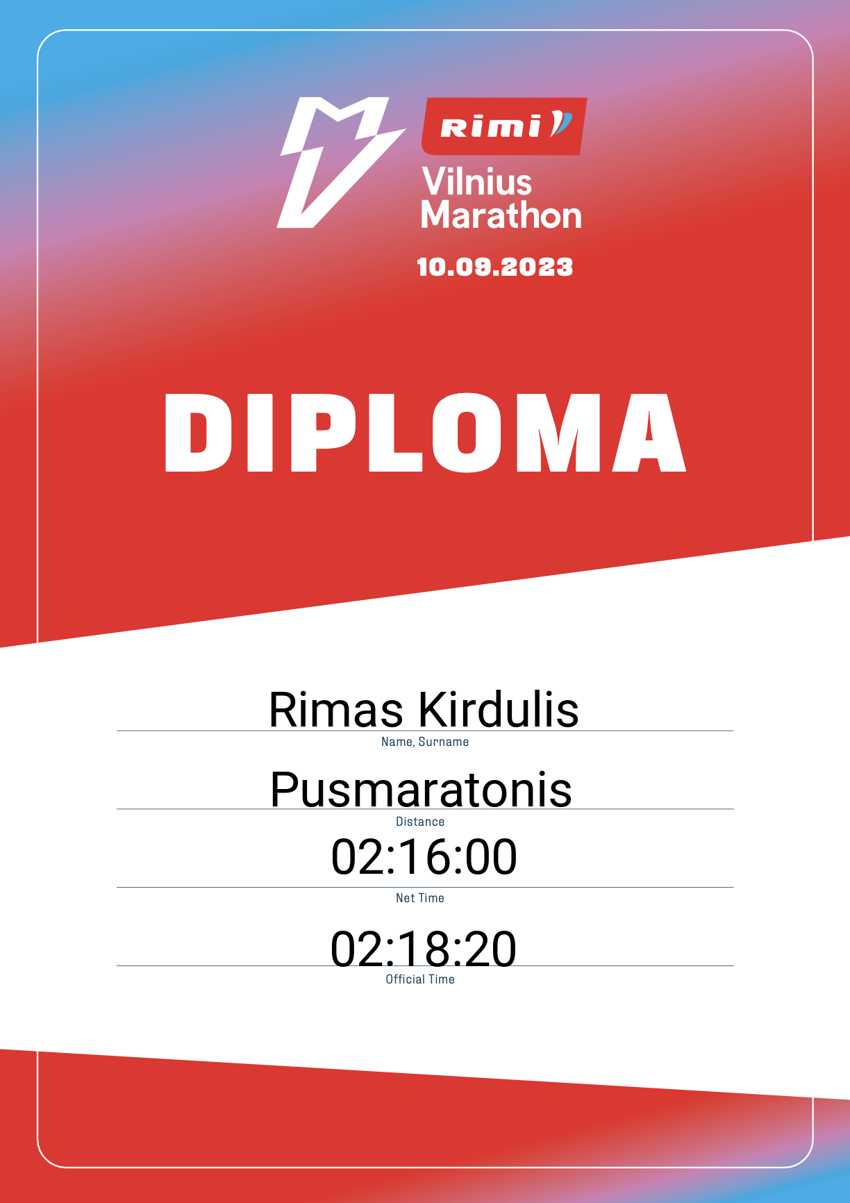 | 1458 | Rimas Kirdulis | LituanicaX | 12055 | Lithuania | Pusmaratonis | 02:18:20 | Diplomas |