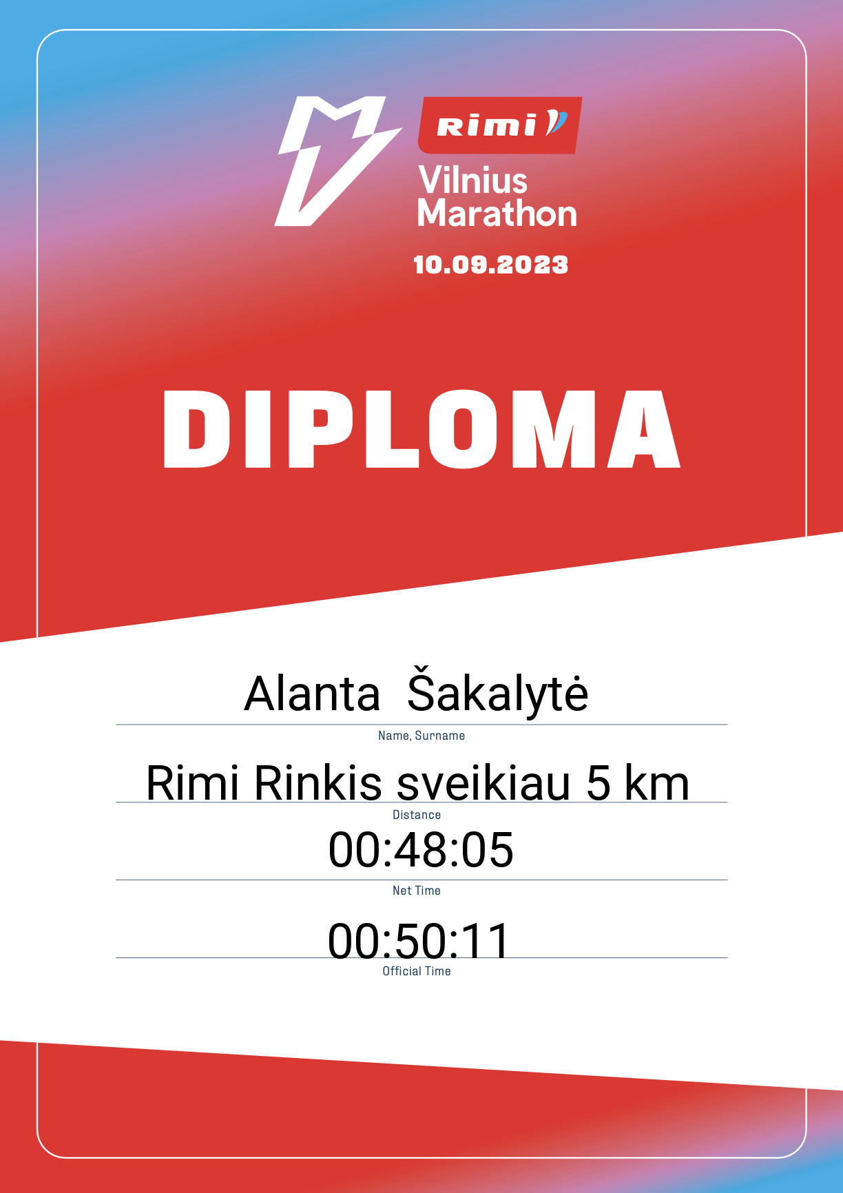 | 2532 | Alanta Šakalytė | Erasmus+ | 32310 | Lithuania | Rimi Rinkis sveikiau 5 km | 00:50:11 | Diplomas |