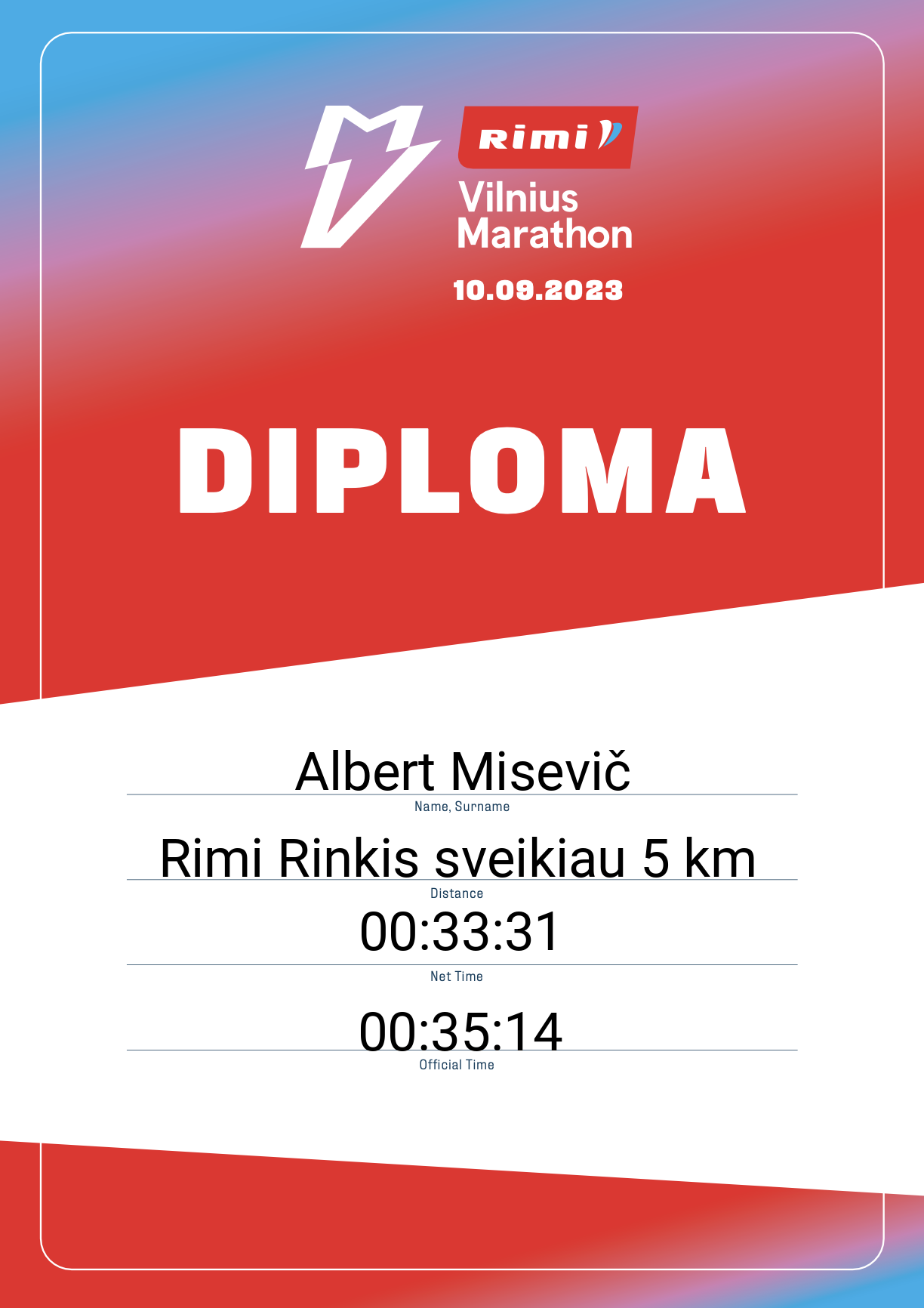 | 1463 | Albert Misevič | 32620 | Lithuania | Rimi Rinkis sveikiau 5 km | 00:35:14 | Diplomas | |