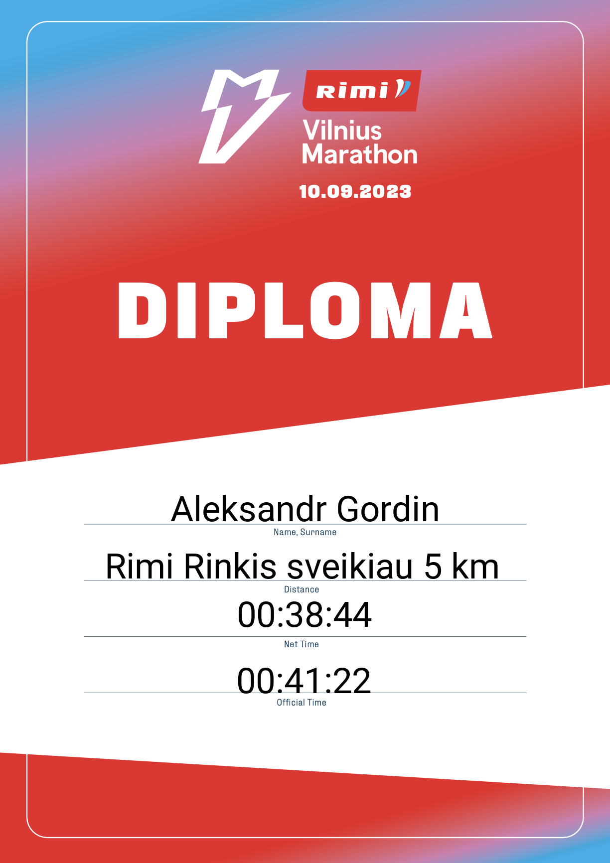| 2187 | Aleksandr Gordin | 30731 | Lithuania | Rimi Rinkis sveikiau 5 km | 00:41:22 | Diplomas | |