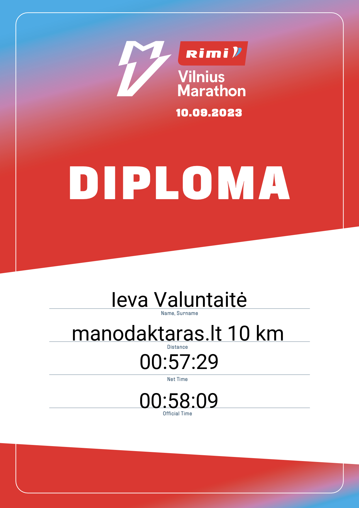 | 838 | Ieva Valuntaitė | Love Streams Running | 22689 | Lithuania | manodaktaras.lt 10 km | 00:58:09 | Diplomas |