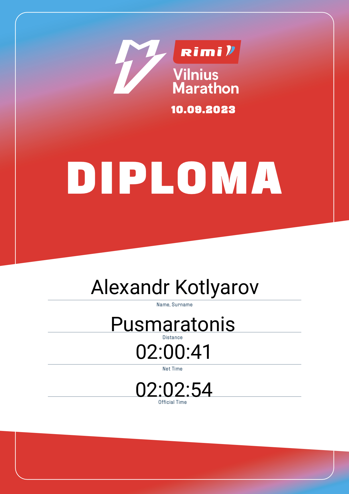 | 226 | Alfredas Chmieliauskas | 13682 | Lithuania | Pusmaratonis | 01:38:37 | Diplomas | |