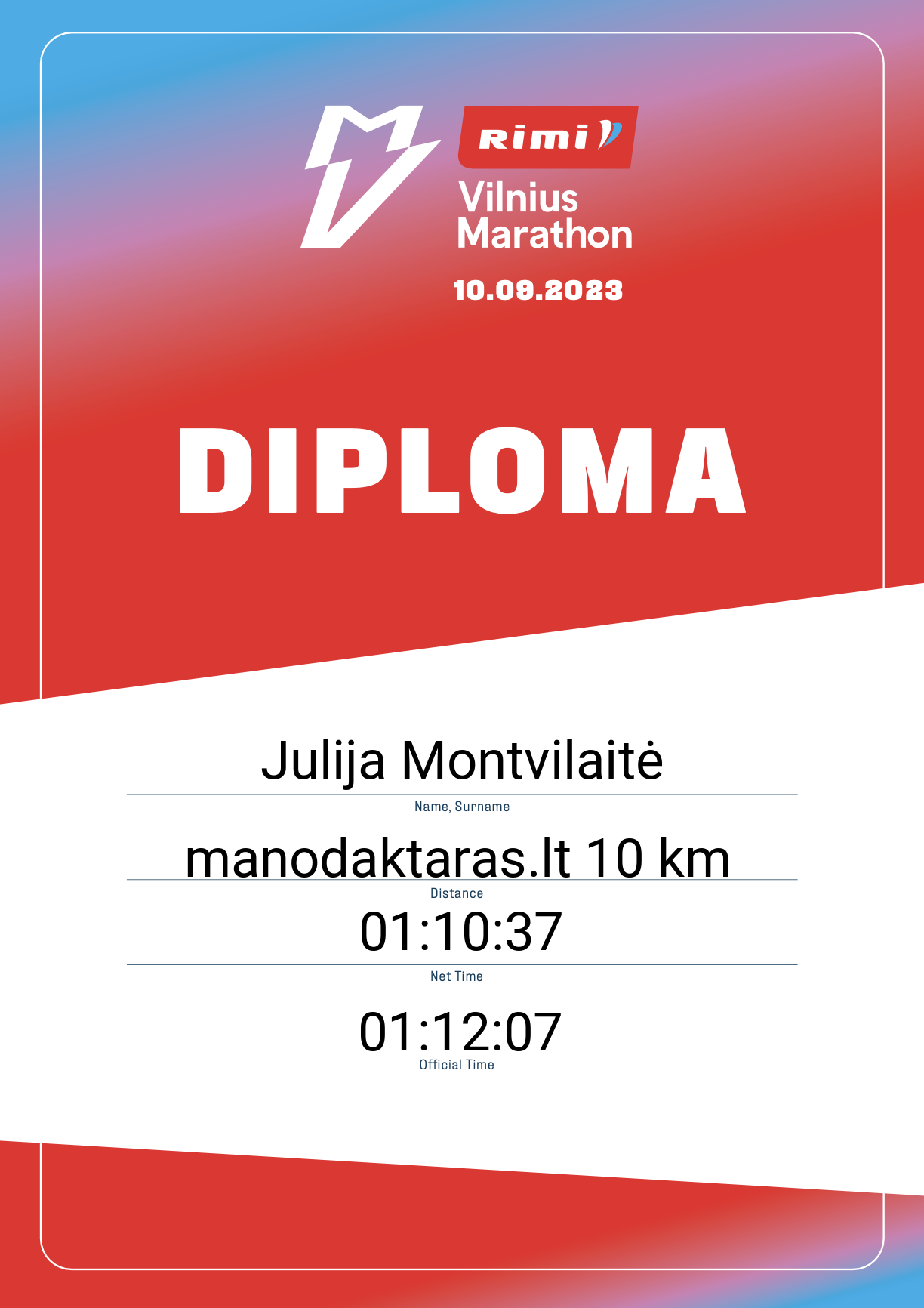 | 1775 | Julija Montvilaitė | jjm | 22205 | Lithuania | manodaktaras.lt 10 km | 01:12:07 | Diplomas |