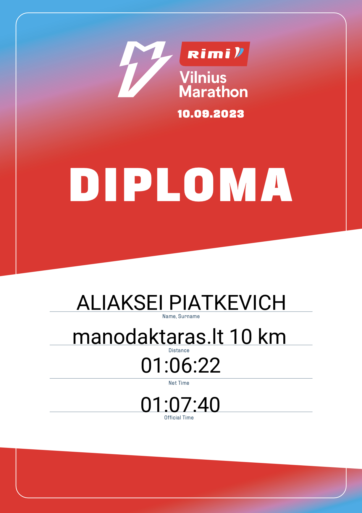 | 1556 | ALIAKSEI PIATKEVICH | Santa team | 22510 | Lithuania | manodaktaras.lt 10 km | 01:07:40 | Diplomas |