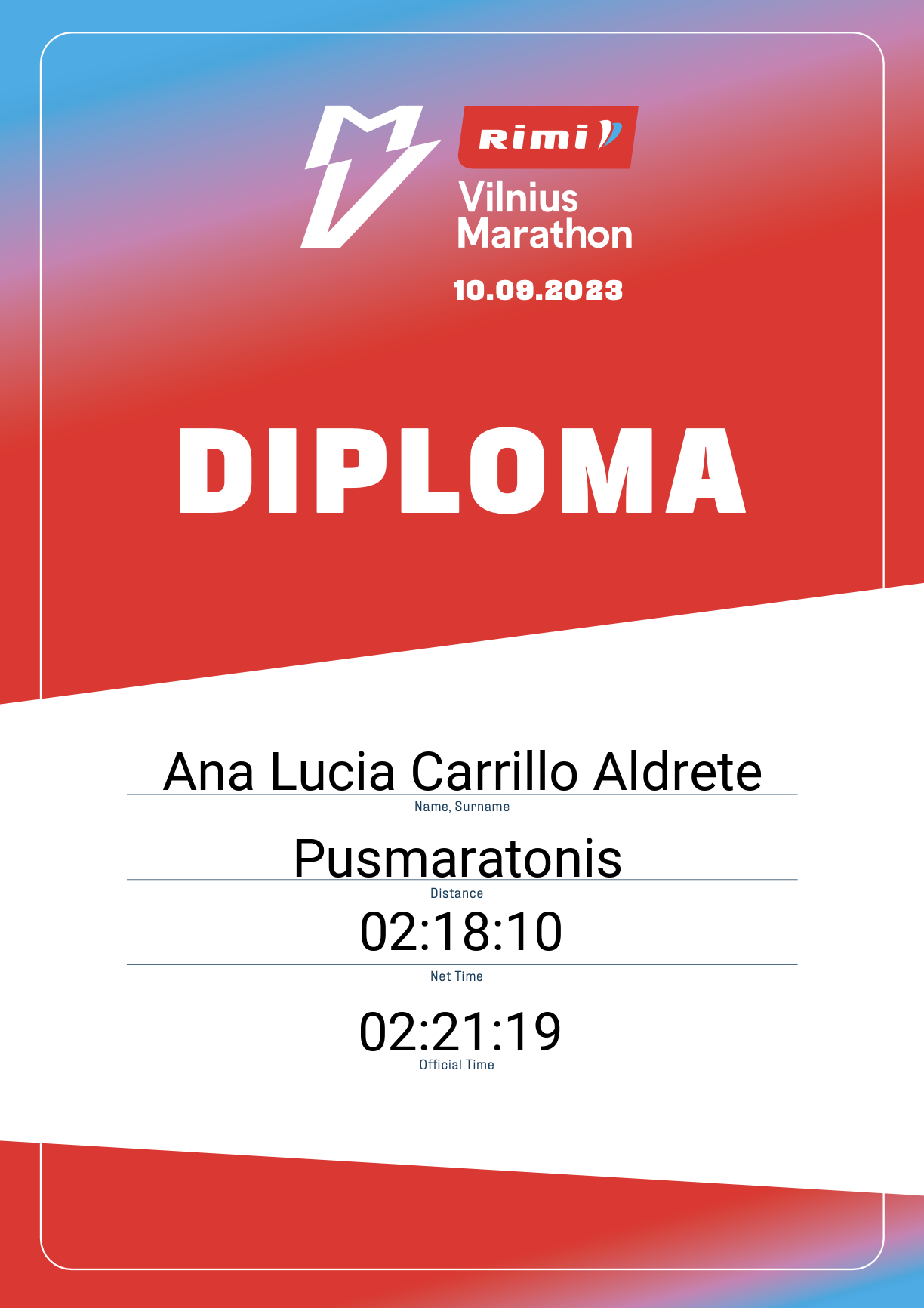 | 426 | Anastasiia Platokhina | KUKA | 12554 | Lithuania | Pusmaratonis | 01:46:14 | Diplomas |