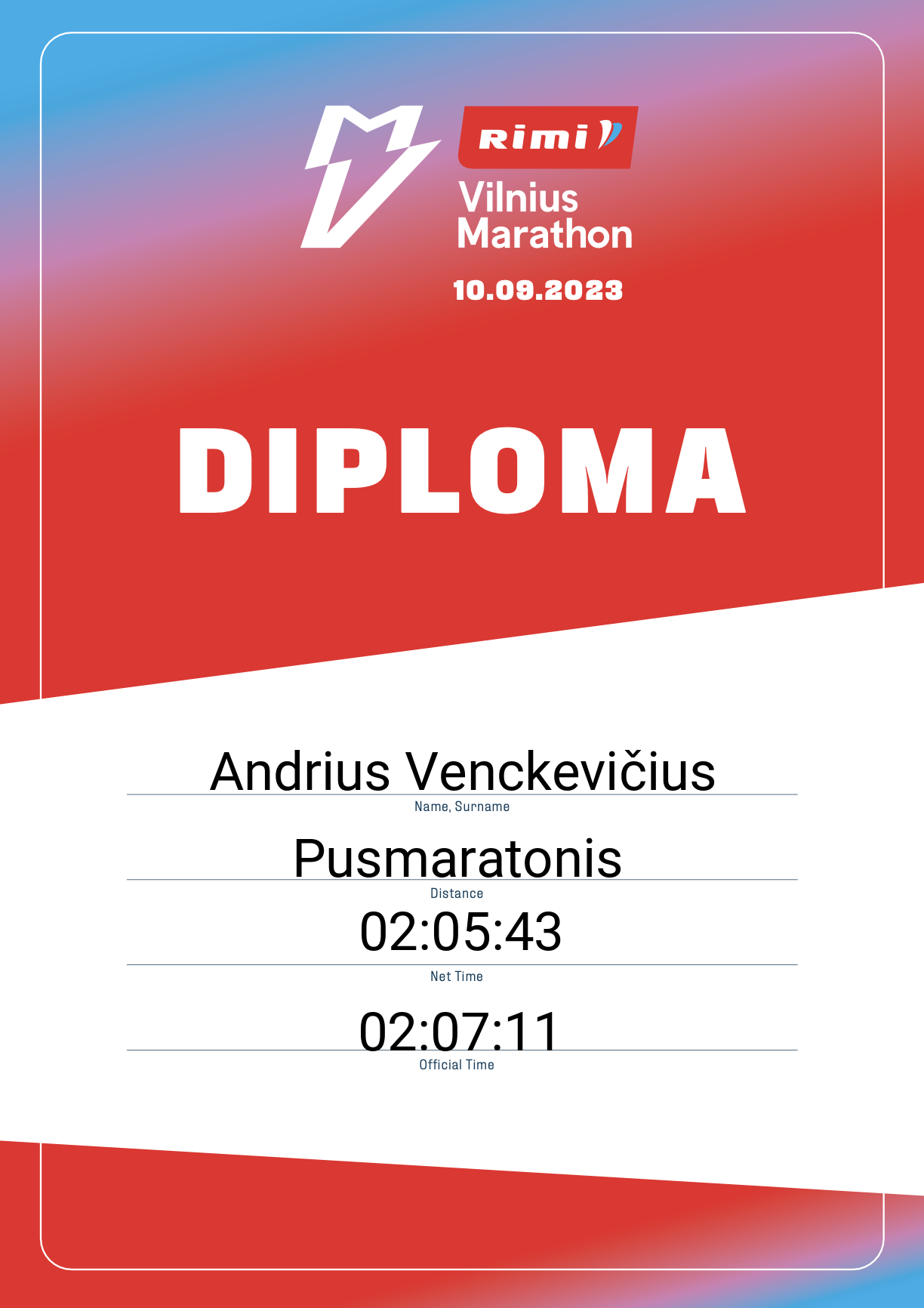 | 1189 | Andrius Venckevičius | FORIT | 12111 | Lithuania | Pusmaratonis | 02:07:11 | Diplomas |