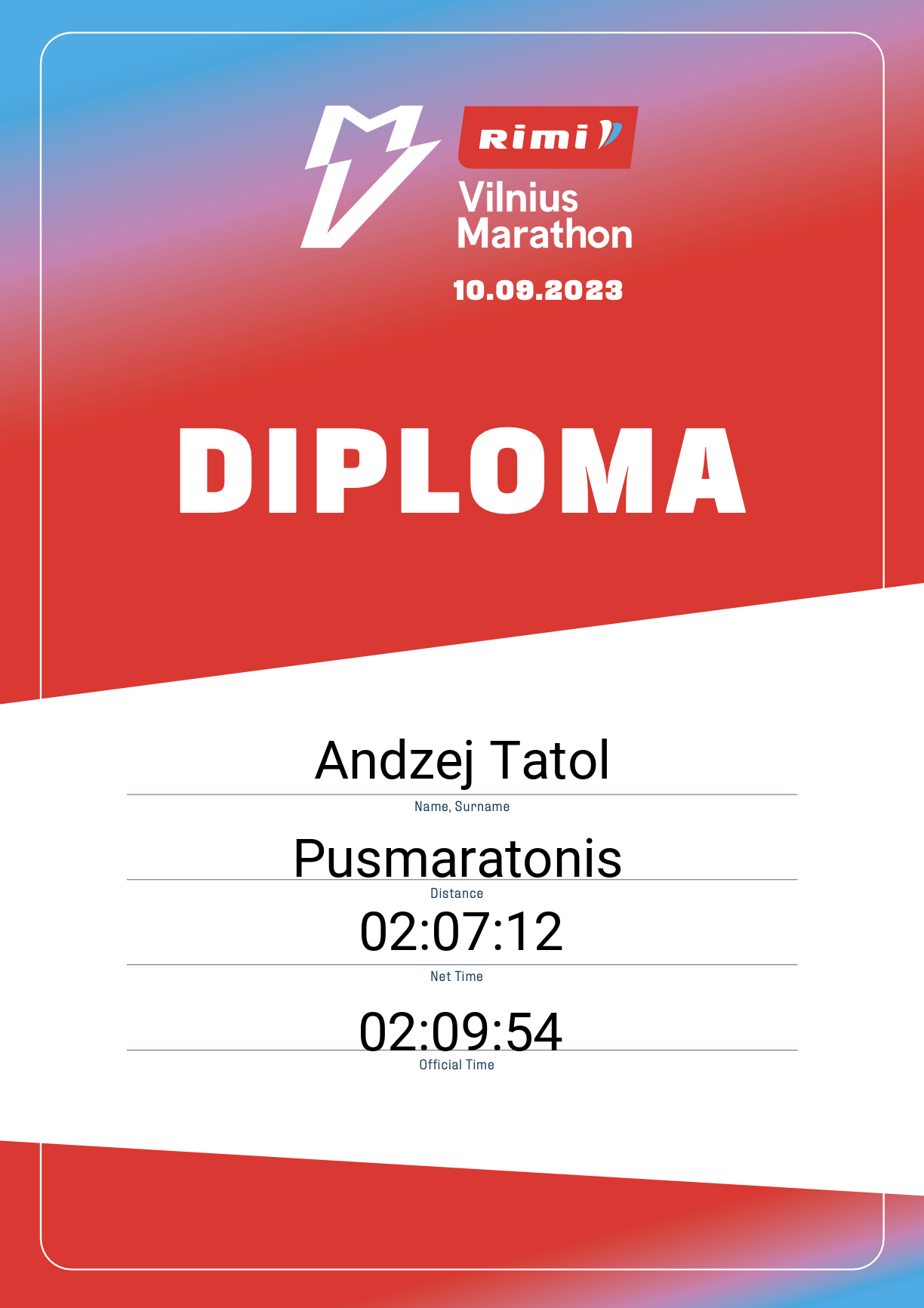 | 1273 | Andzej Tatol | Visma Tech | 12629 | Lithuania | Pusmaratonis | 02:09:54 | Diplomas |