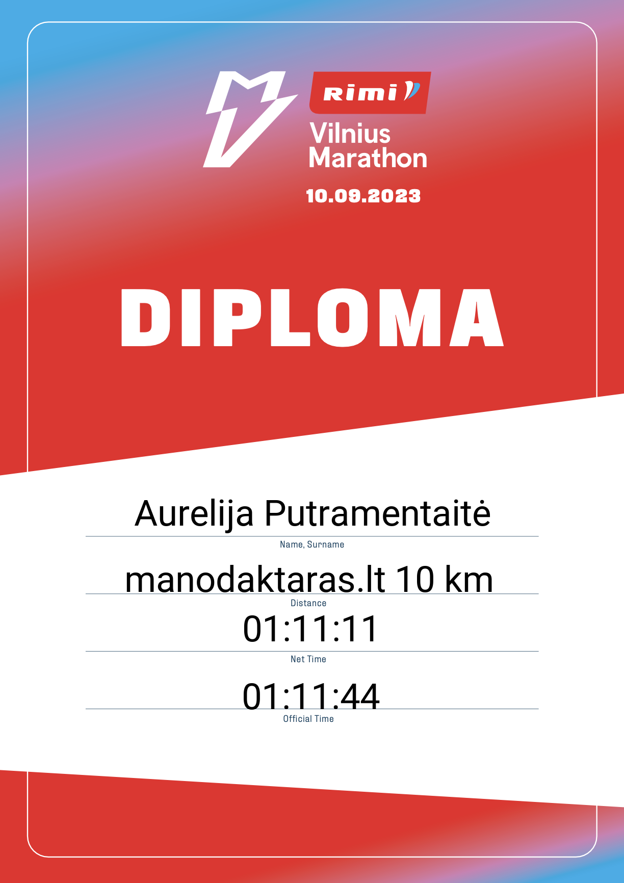 | 1766 | Aurelija Putramentaitė | 22465 | Lithuania | manodaktaras.lt 10 km | 01:11:44 | Diplomas | |