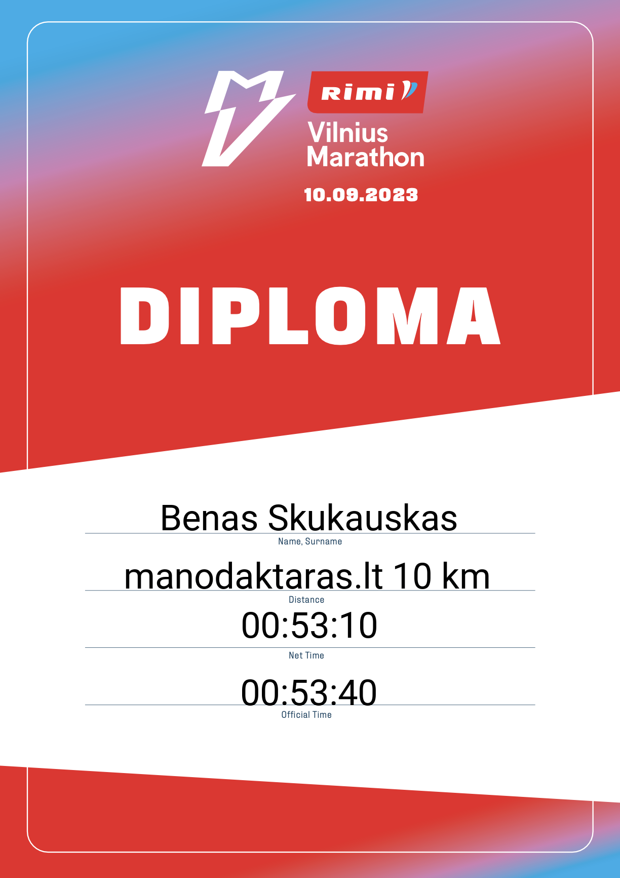 | 466 | Benas Skukauskas | Karmushka | 21045 | Lithuania | manodaktaras.lt 10 km | 00:53:40 | Diplomas |