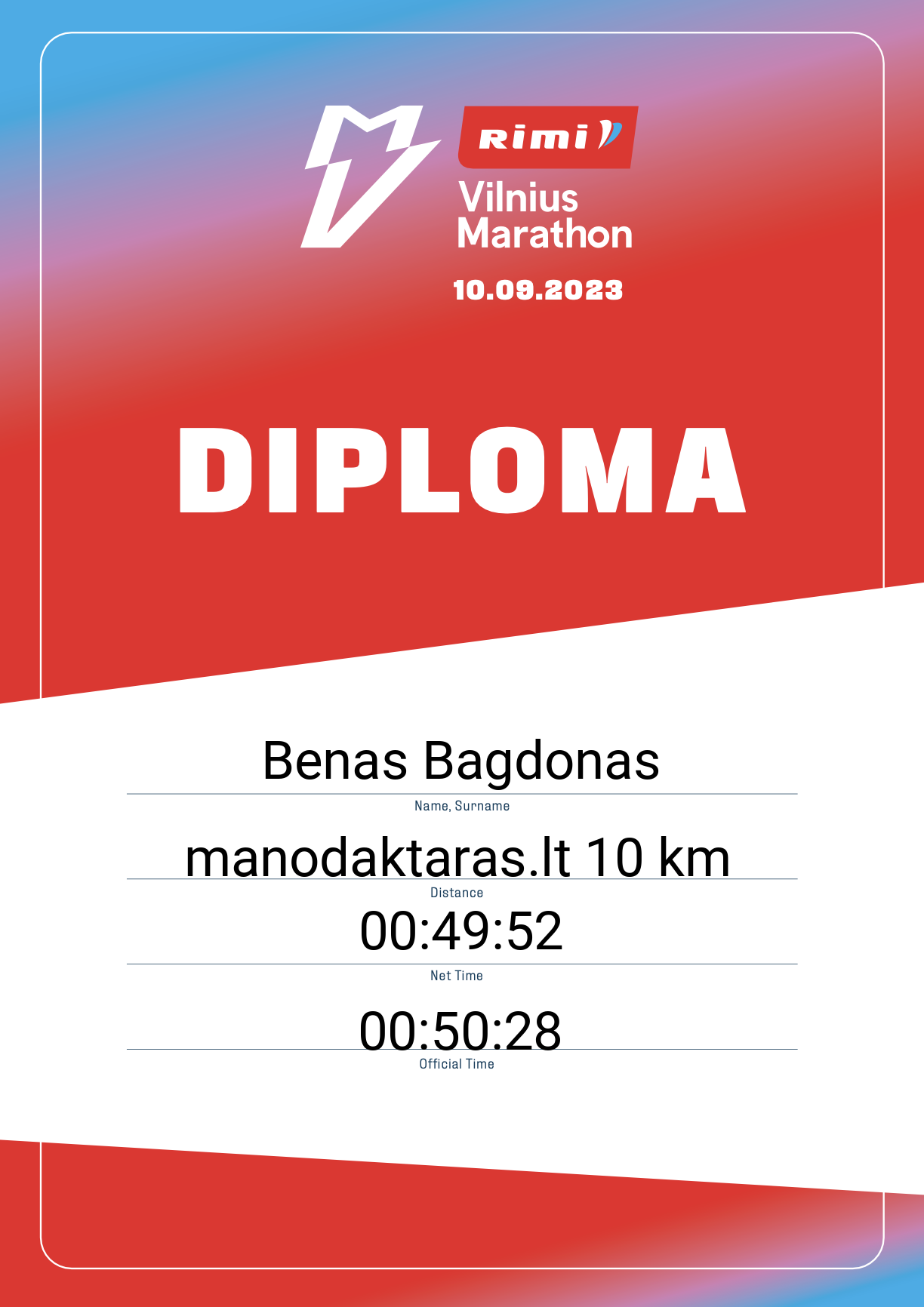 | 283 | Benas Bagdonas | 22588 | Lithuania | manodaktaras.lt 10 km | 00:50:28 | Diplomas | |