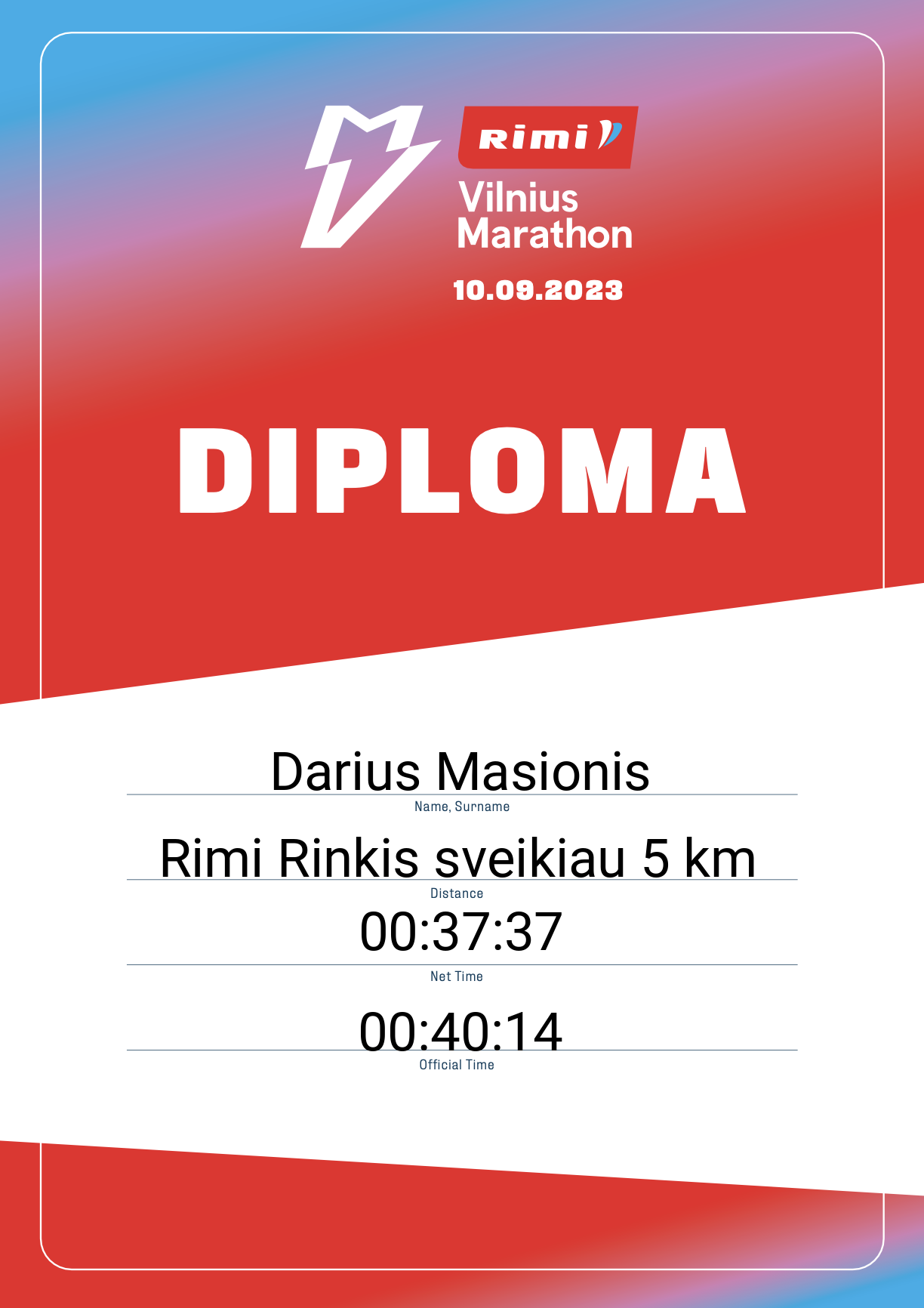 | 2101 | Darius Masionis | BOST | 32597 | Lithuania | Rimi Rinkis sveikiau 5 km | 00:40:14 | Diplomas |