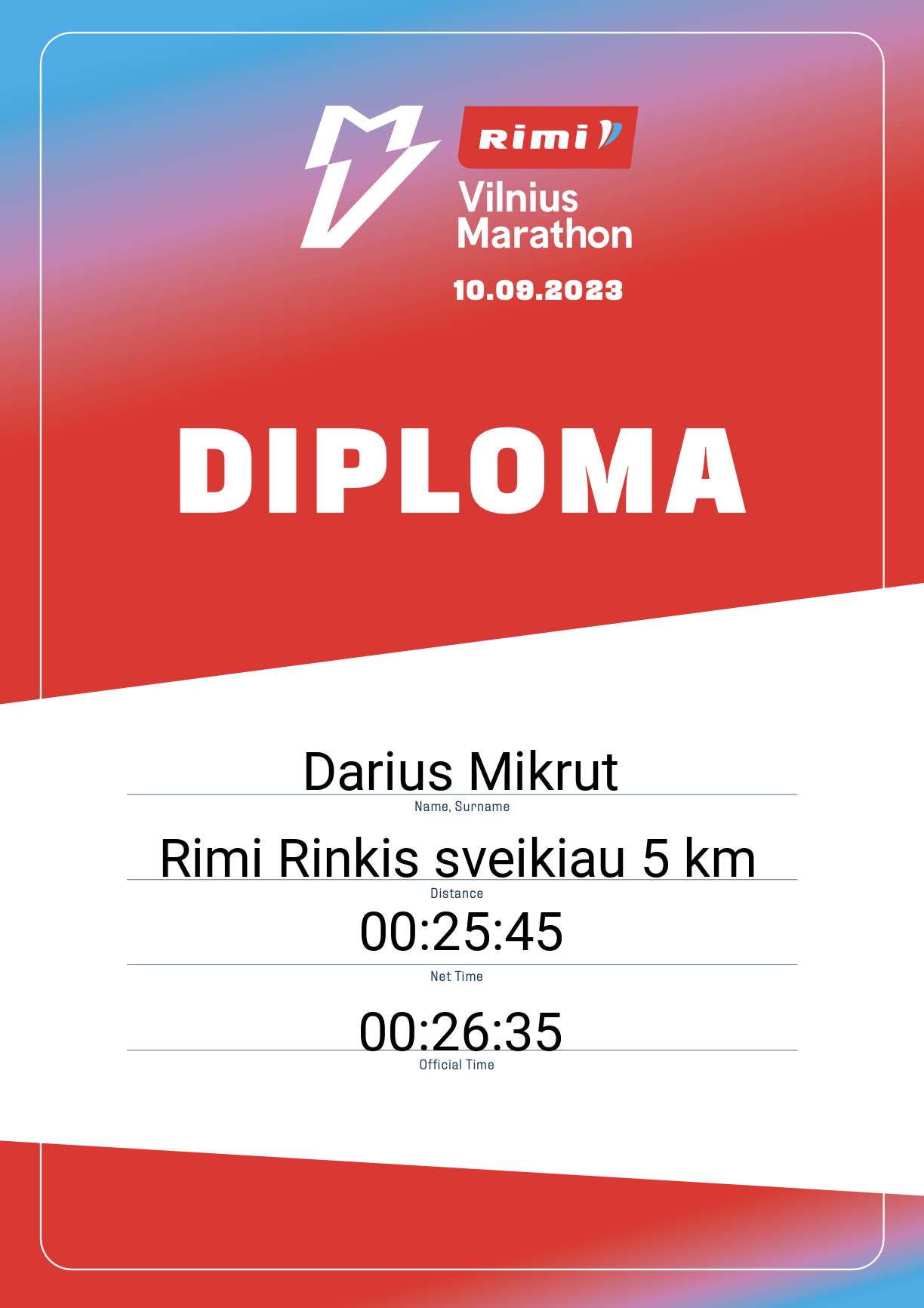 | 369 | Darius Mikrut | 33456 | Lithuania | Rimi Rinkis sveikiau 5 km | 00:26:35 | Diplomas | |