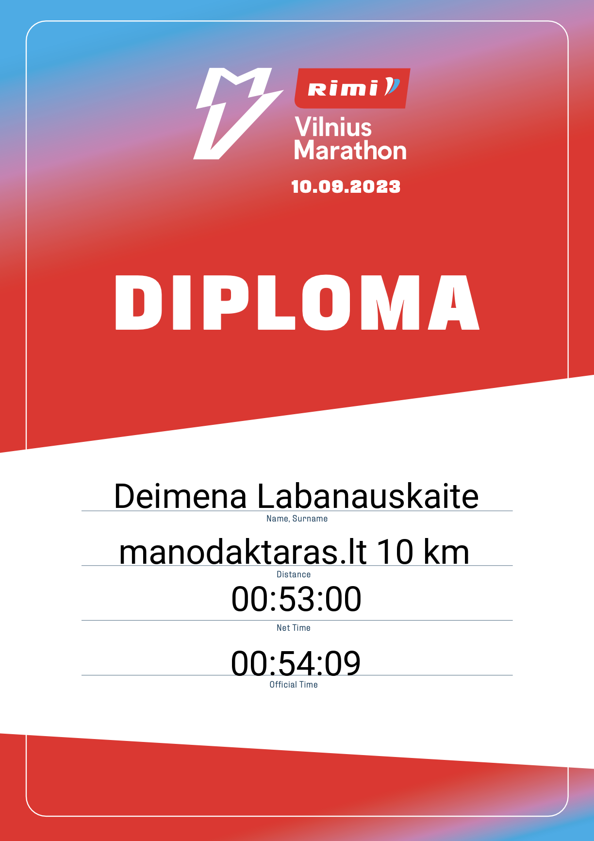 | 1083 | Deimante Rucyte | 22355 | Lithuania | manodaktaras.lt 10 km | 01:00:54 | Diplomas | |
