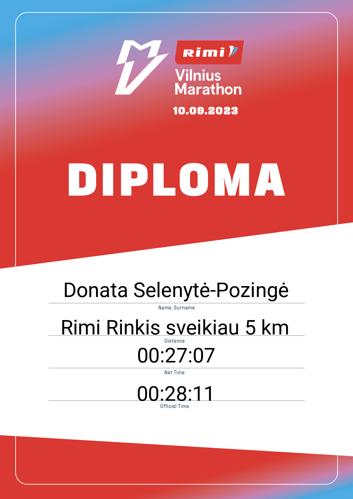 | 523 | Donata Selenytė-Pozingė | 32936 | Lithuania | Rimi Rinkis sveikiau 5 km | 00:28:11 | Diplomas | |