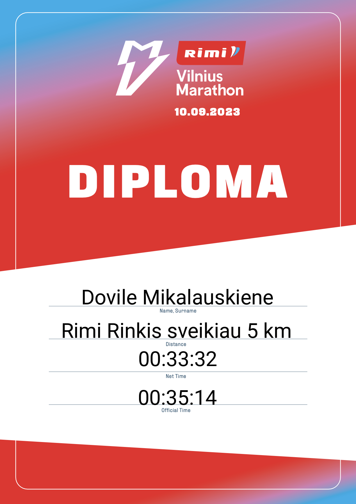 | 1464 | Dovile Mikalauskiene | 33279 | Lithuania | Rimi Rinkis sveikiau 5 km | 00:35:14 | Diplomas | |